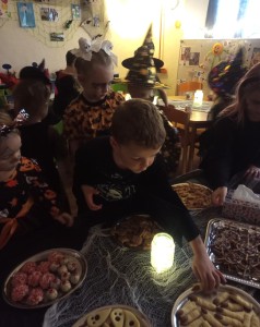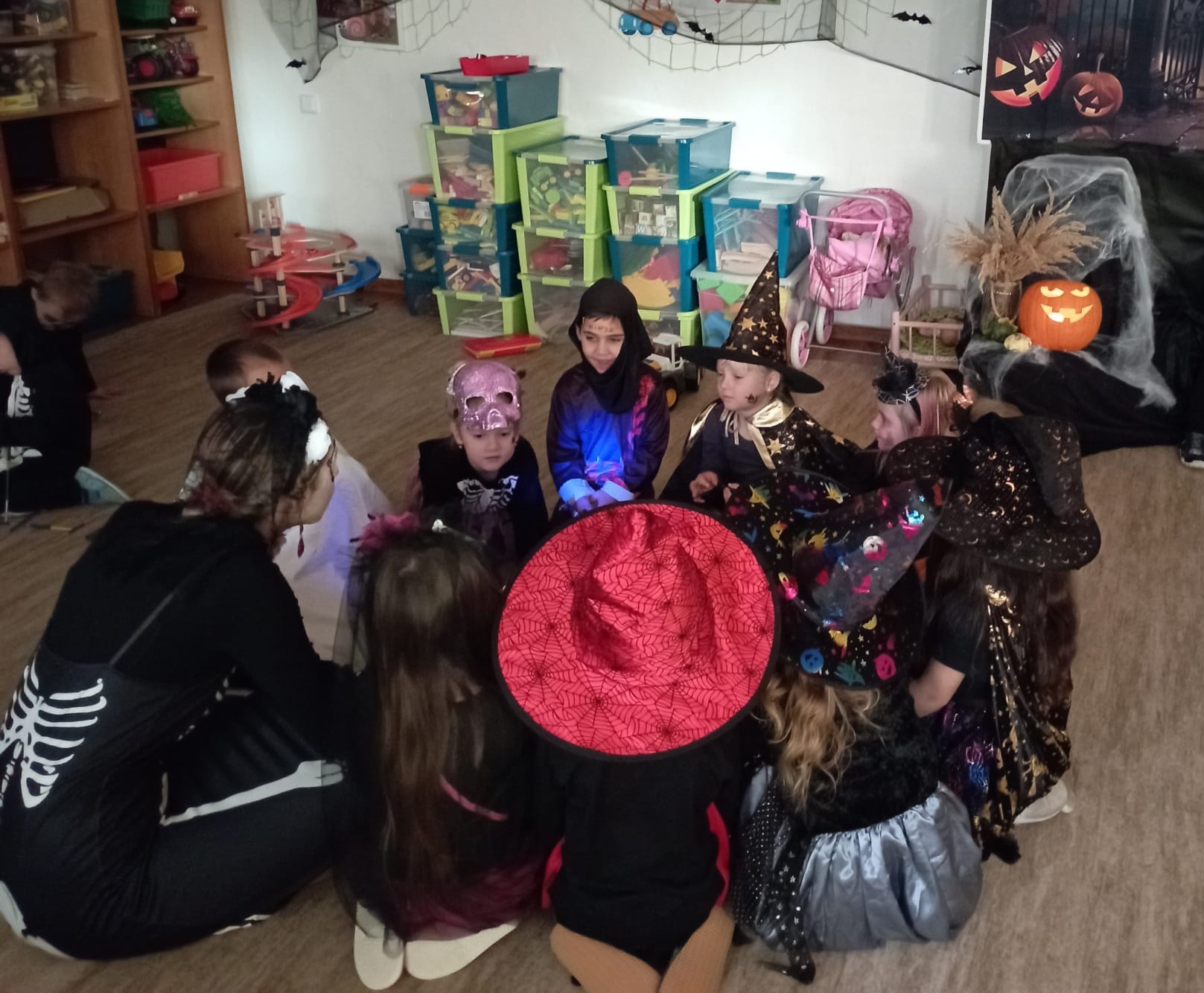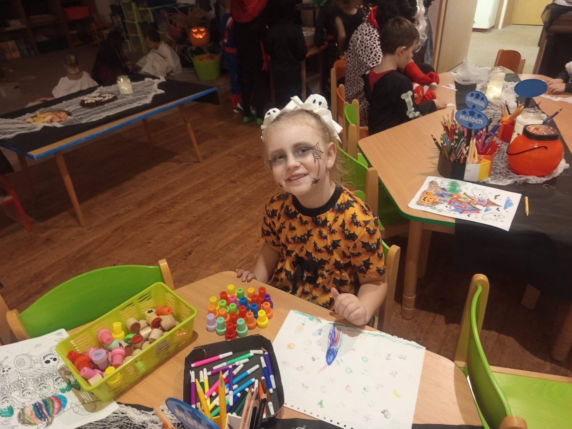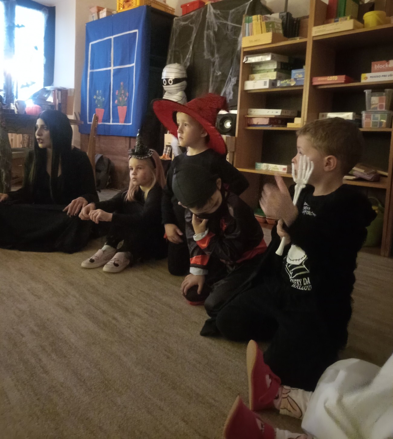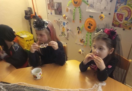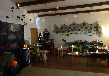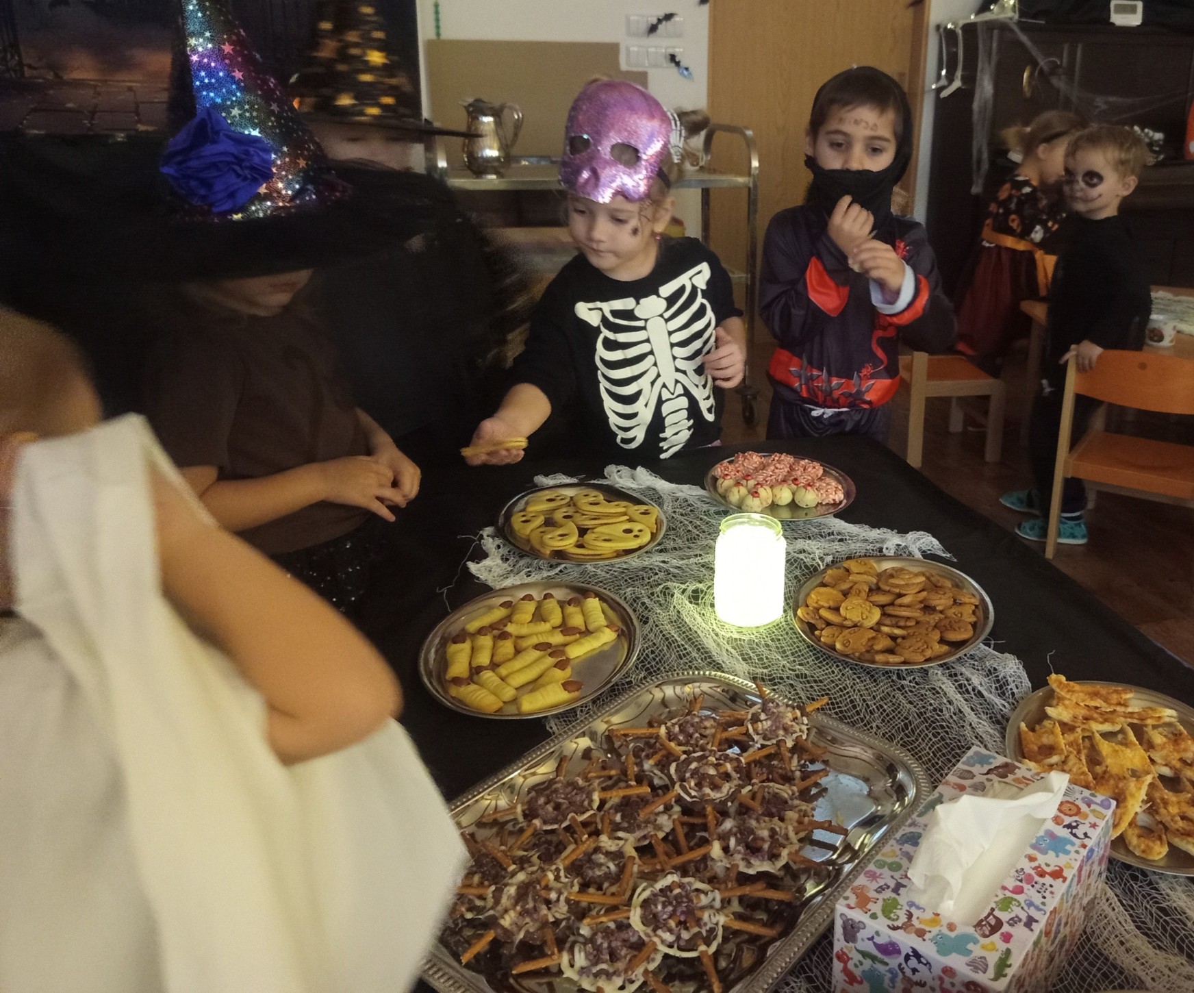 Halloween to je především tajemno a trochu strašidelno. Jsou to dýně, svíčky, pavouci s jejich všudepřítomnými sítěmi a další různé magické věci. To vše bylo na tento den pro dětičky připraveno! Dohodli jsme se s nimi, že od samého rána budou to třídy přicházet již v přestrojení a byla to panečku přehlídka všech možných postav. Ve dveřích se nám objevovali: kostlivci, čarodějnice, kouzelníci, netopýři, duchové a dokonce jsme tu měli i Ninju. Bylo znát, že si na maskách dali v tento den všichni záležet a to včetně paní učitelek i paní Chmelářové. Ráno děti využily připravený fotokoutek, kde se nechaly zvěčnit na památku. Poté jsme hráli různé tématické hry, tancovali, zpívali a také zkusili jeden pokus s čajovými sáčky. Po těchto aktivitách logicky vyhládne, takže jsme se pustili do nachystaného halloweenského rautu. Podávali se mozečky, perníkové mumie, duchové, pavučiny, prsty od čarodějnice, tématické perníčky a největší delikatesou byly oční bulvy - recept k dostání u paní učitelky Toroni :) A co na to říkaly děti? Vůbec se toho nezalekly a s chutí se do toho nevšedního občerstvení pustily.