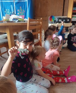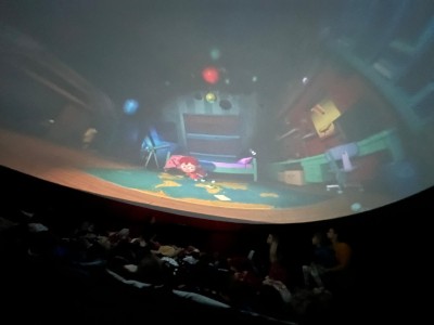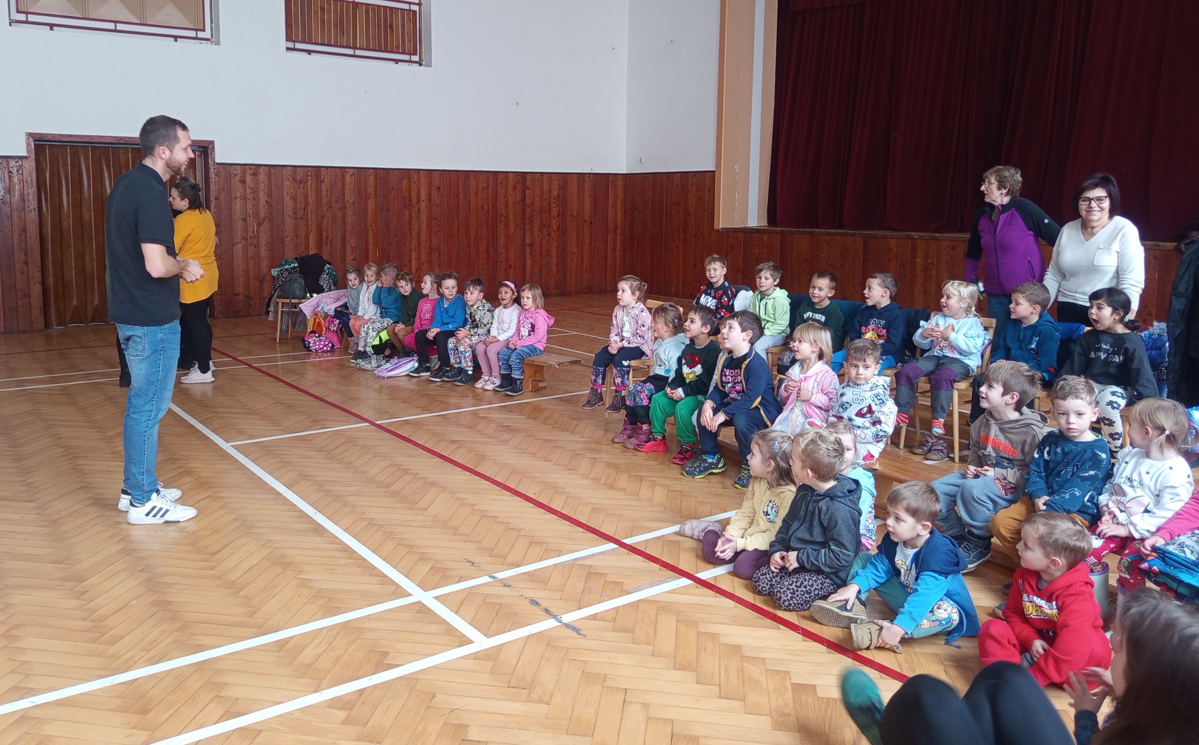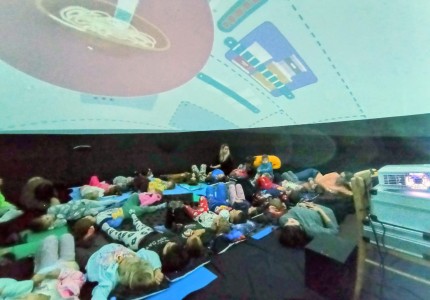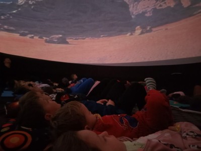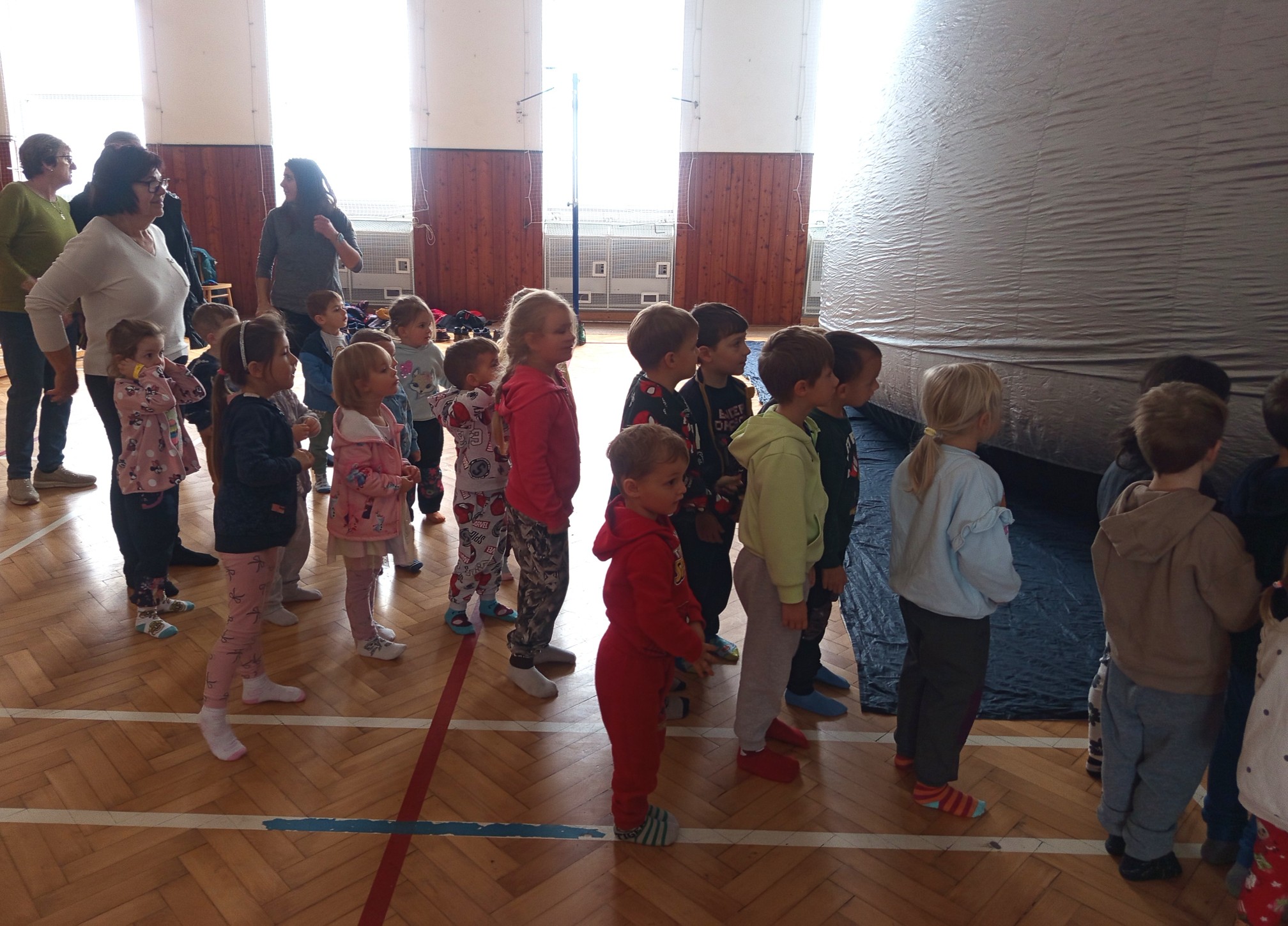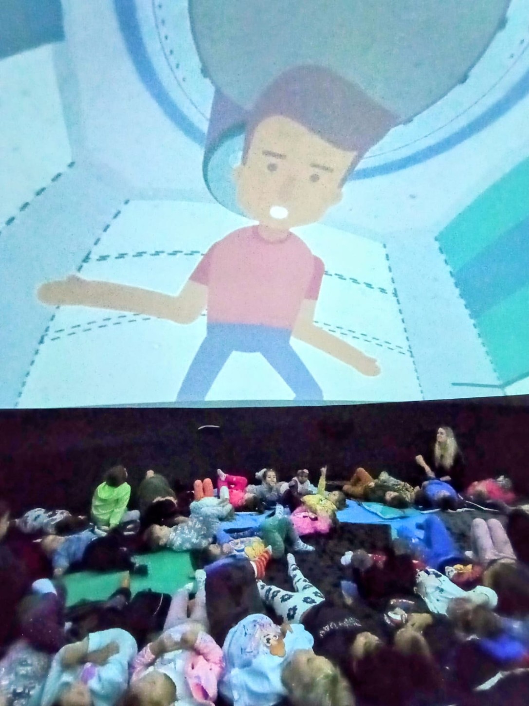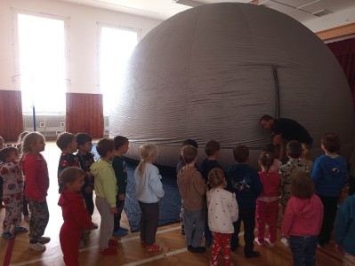 Na úterý jsme dětem domluvili další nevšední zážitek. Přijelo k nám mobilní Planetárium Morava, což je projekční koule, jehož vnitřní plocha slouží ke sférickému promítání. Planetárium bylo tak velké, že jsme museli využít prostor v kulturním domě (za vše kolem zařízení děkujeme paní starostce) a rádi jsme opět přizvali naše kamarády z MŠ Kamenná. Přivítal nás pán, který nám vysvětlil vše co nás v následující hodince a půl čeká. Uvnitř byly nachystané deky s polštáři a tak si děti udělaly pohodlí a mohlo se začít. První film byl o dinosaurech a vzniku Země. Druhý o vesmíru, planetách a co obnáší práce kosmonauta. Dětem se promítání moc líbílo a jako dárek si do školky odnesly tématické pexeso.
