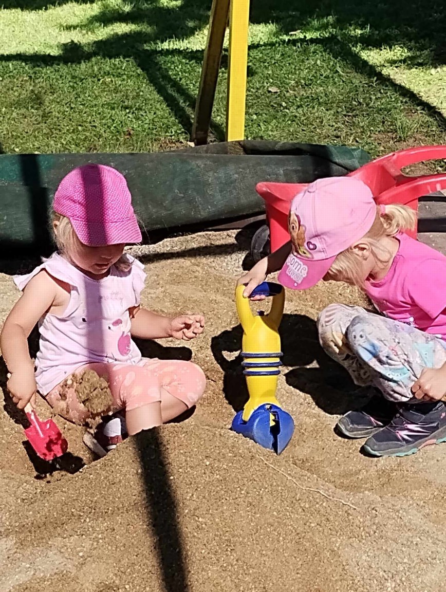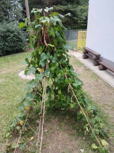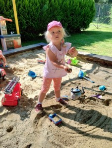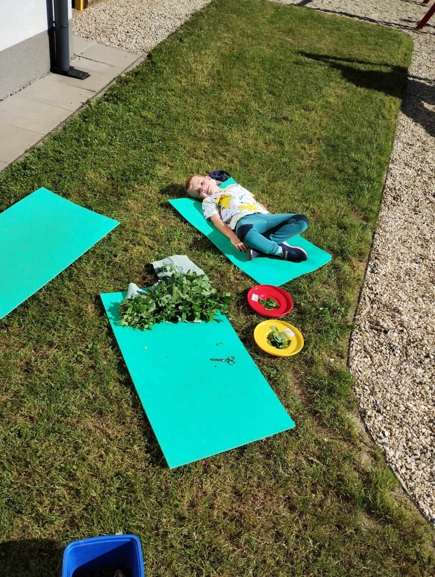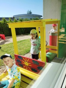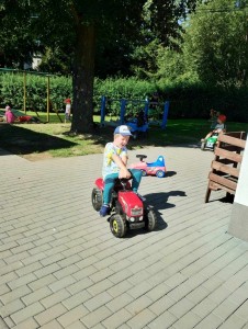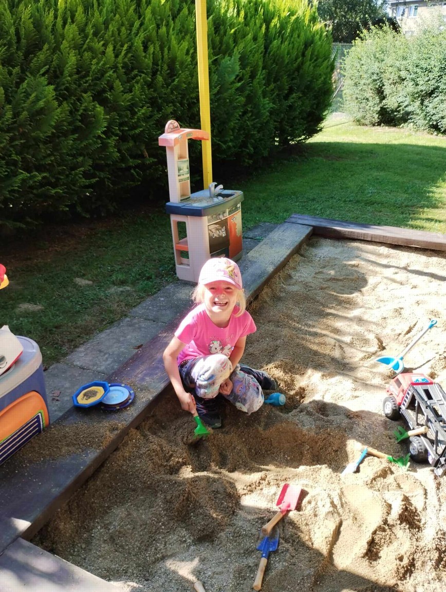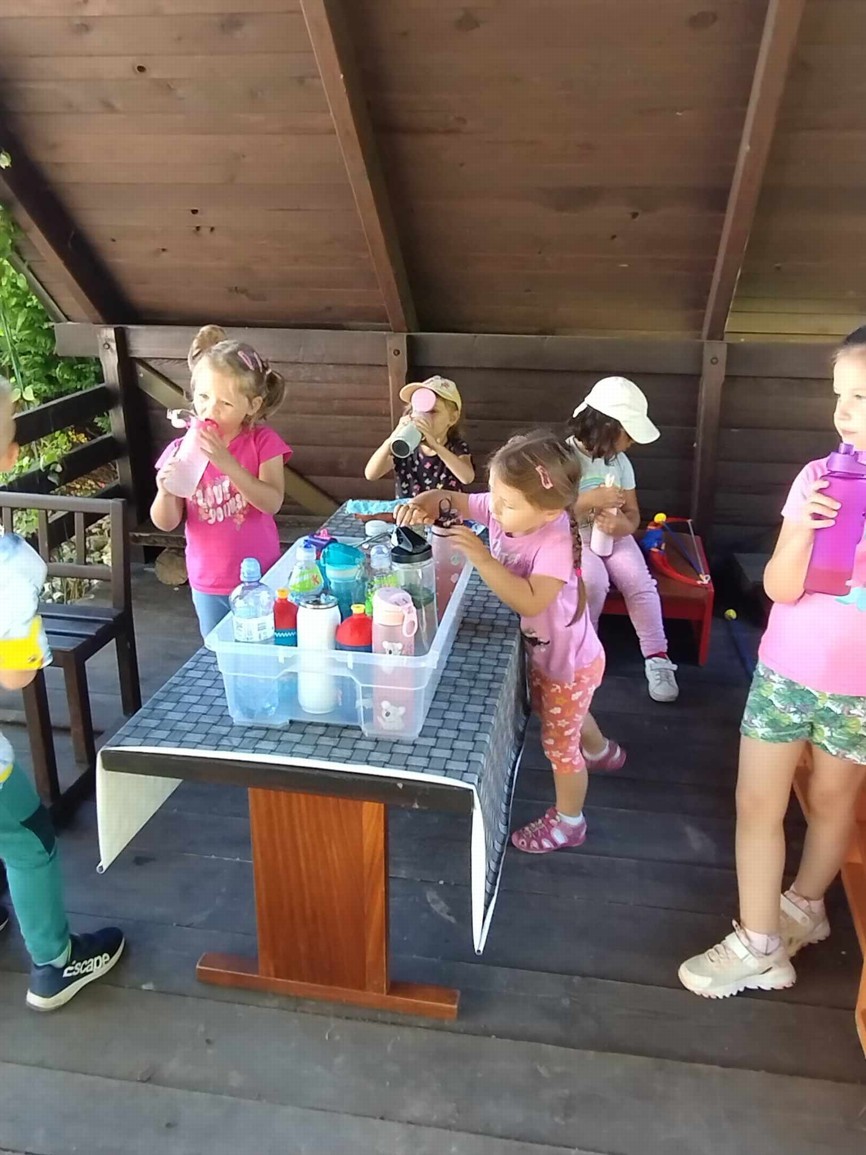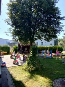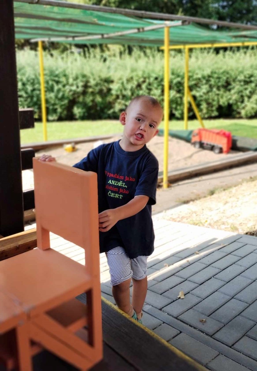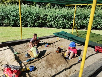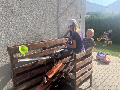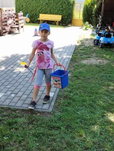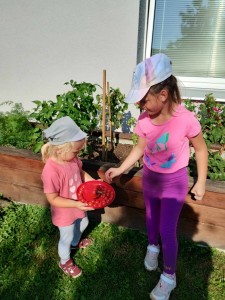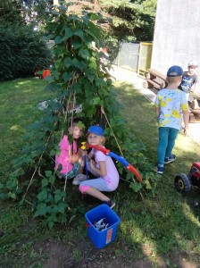 Máme nádherné počasí. Sluníčko krásně hřeje a nám je na zahrádce moc dobře. Hrajeme si, sportujeme, sklízíme plody z naší zeleninové a bylinkové zahrádky.