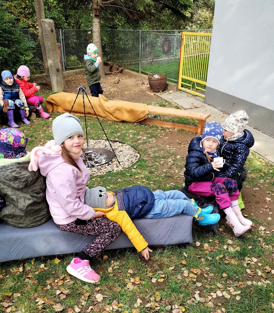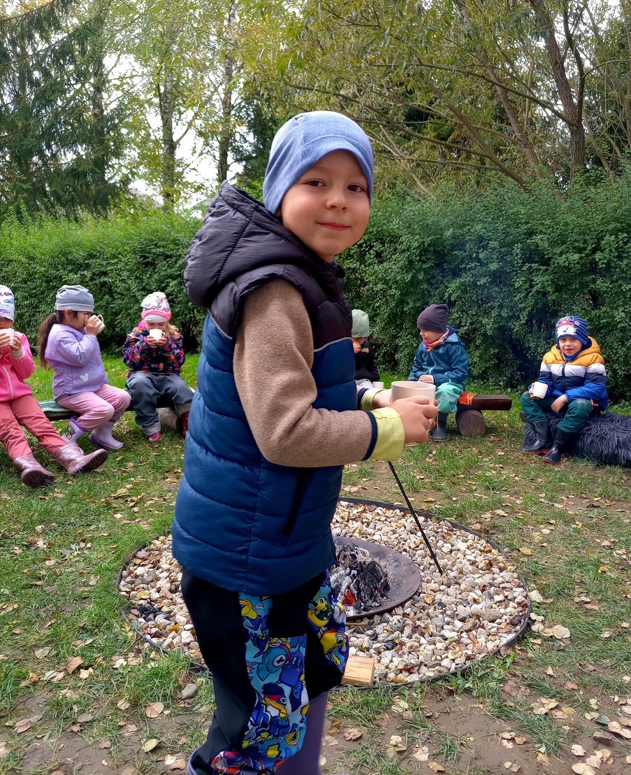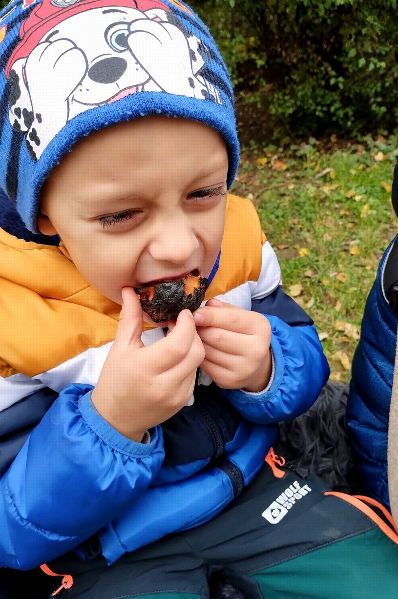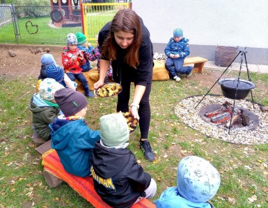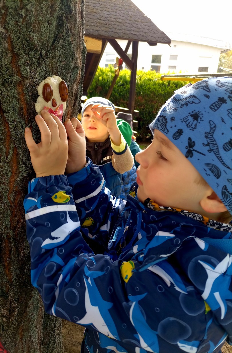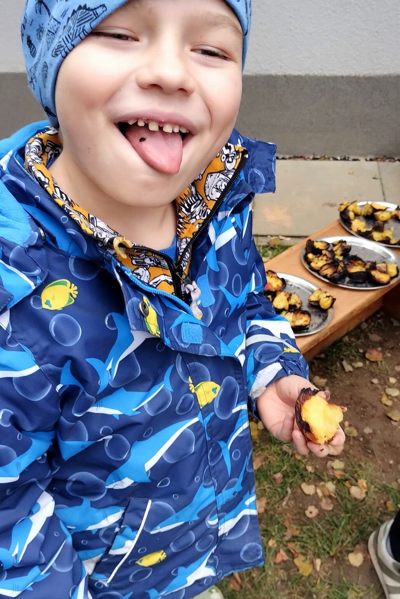 Od samého rána se něco zajímavého dělo. Začalo se tím, že každé z dětí si po příchodu do třídy zabalilo bramboru do alobalu, ale co se s ní bude dít dál? To byla nejčastěší otázka malých zvídálků. Odpovědi se dětem dostalo hned po svačince, kdy se převlékly do teplého oblečení a přišly na zahrádku. Tam už paní učitelky měly rozdělaný oheň a mohli jsme společně do peřinky z popela uložit připravené brambory. No a abychom si čekání zkrátili, vydali jsme se natrhat šípky na čaj a také nasbírat nějaké podzimní plody na tvoření. Máme štěstí, že kolem školky je všechno blízko - jak šípkový keř tak i přírodní materiál jako jsou šišky, žaludy nebo různé druhy listí. Po přinesení šípků bylo nutné je rozpůlit a toho se ujaly všechny děti. Při zacházením s nožem byly moc šikovní a práce jim šla hezky od ruky. Paní učitelky nachystaly kotlík s teplou vodou, vložily nakrájené šípky a med. Než nám stačil čaj projít varem už jsme se nedočkavě pustili do pečených brambor. Většina dětí je ochutnávala poprvé a musíme přiznat, že měly docela úspěch (příště jen vychytáme dobu pečení). Po ochutnávce brambor a skvělého šípkové čaje přišla na řadu kreativní činnost - stromový, podzimní bubáci z těsta. Děti si je podle libosti mohly ozdobit jakýmkoliv materiálem, který byl k dispozici.