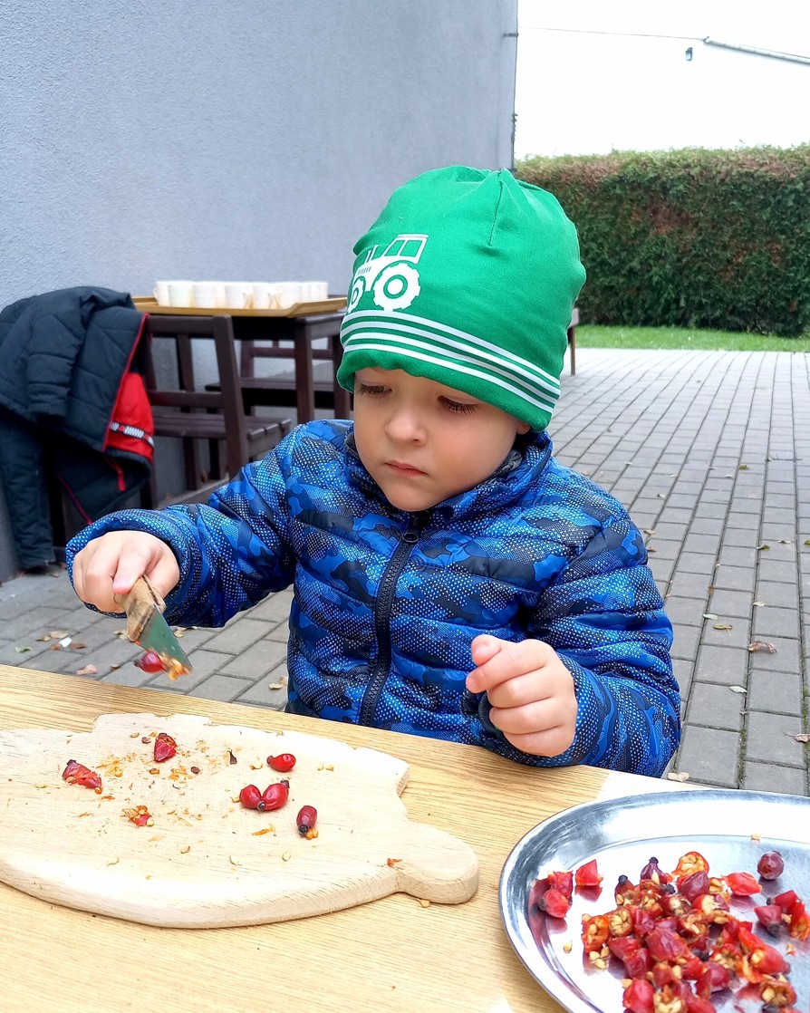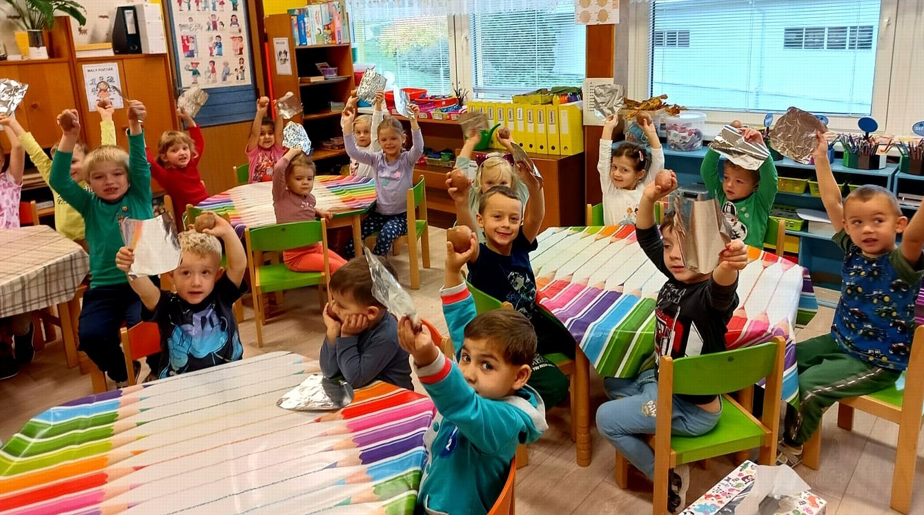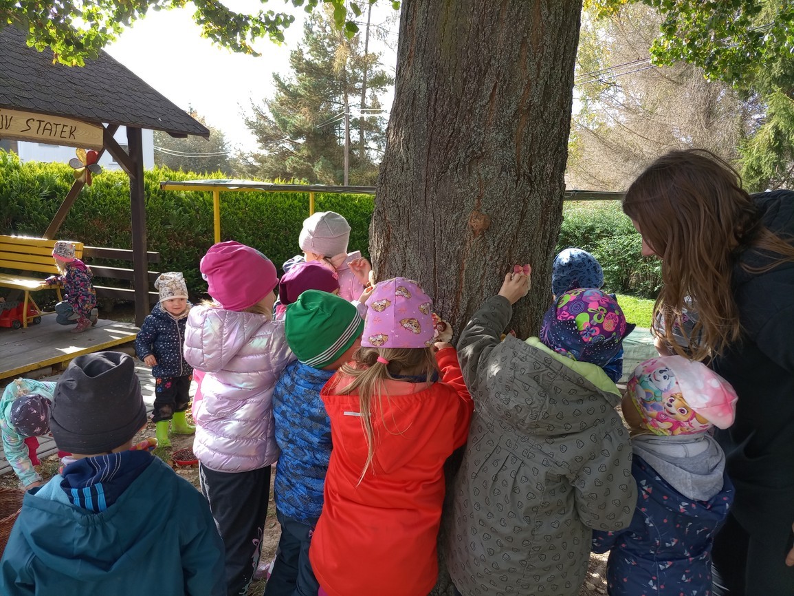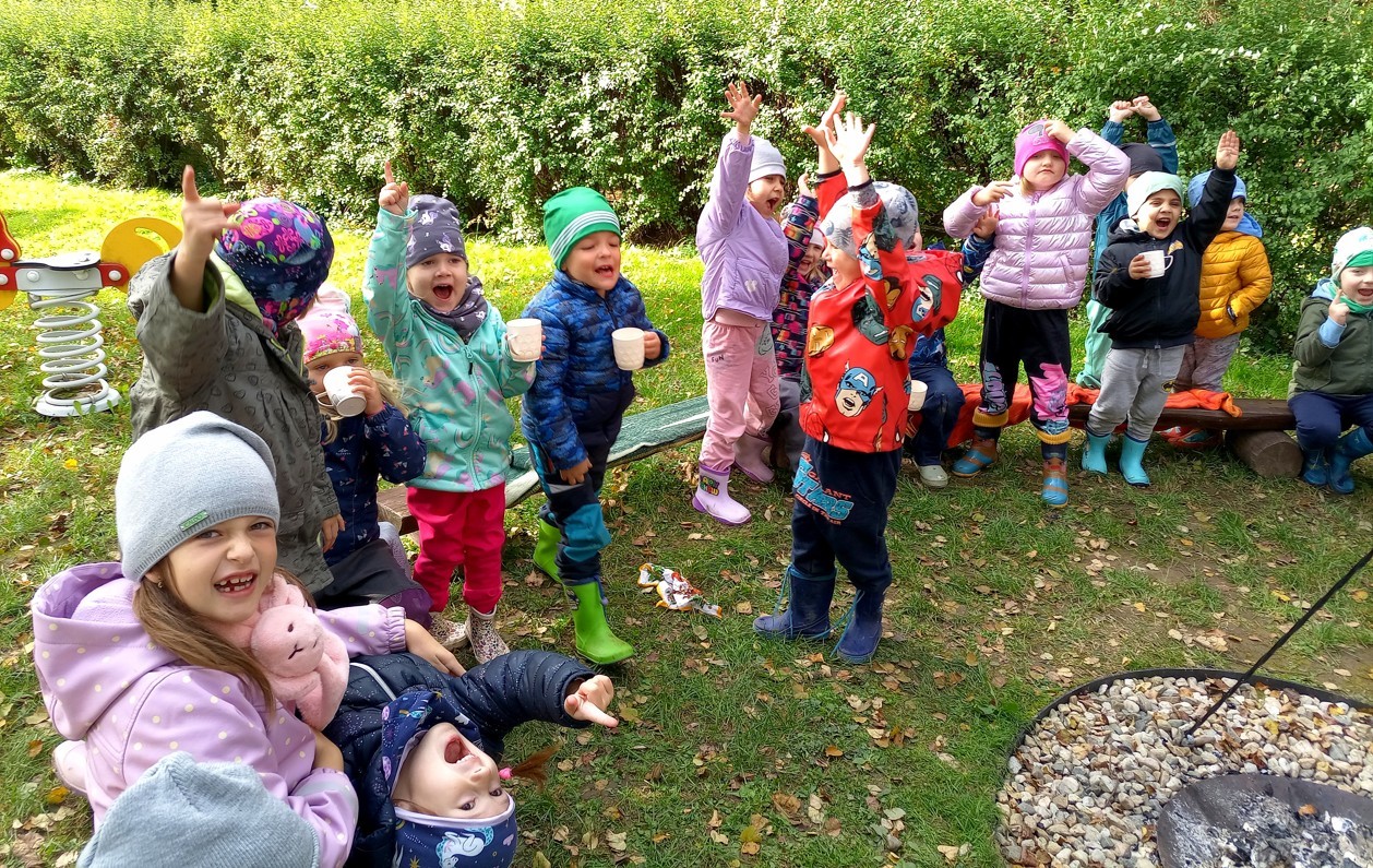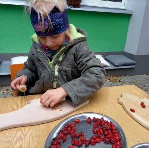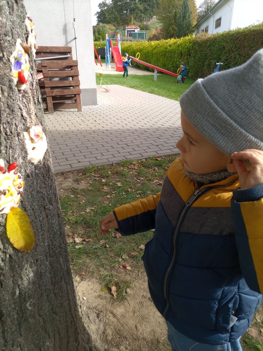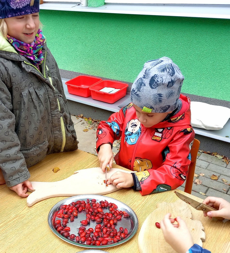 Od samého rána se něco zajímavého dělo. Začalo se tím, že každé z dětí si po příchodu do třídy zabalilo bramboru do alobalu, ale co se s ní bude dít dál? To byla nejčastěší otázka malých zvídálků. Odpovědi se dětem dostalo hned po svačince, kdy se převlékly do teplého oblečení a přišly na zahrádku. Tam už paní učitelky měly rozdělaný oheň a mohli jsme společně do peřinky z popela uložit připravené brambory. No a abychom si čekání zkrátili, vydali jsme se natrhat šípky na čaj a také nasbírat nějaké podzimní plody na tvoření. Máme štěstí, že kolem školky je všechno blízko - jak šípkový keř tak i přírodní materiál jako jsou šišky, žaludy nebo různé druhy listí. Po přinesení šípků bylo nutné je rozpůlit a toho se ujaly všechny děti. Při zacházením s nožem byly moc šikovní a práce jim šla hezky od ruky. Paní učitelky nachystaly kotlík s teplou vodou, vložily nakrájené šípky a med. Než nám stačil čaj projít varem už jsme se nedočkavě pustili do pečených brambor. Většina dětí je ochutnávala poprvé a musíme přiznat, že měly docela úspěch (příště jen vychytáme dobu pečení). Po ochutnávce brambor a skvělého šípkové čaje přišla na řadu kreativní činnost - stromový, podzimní bubáci z těsta. Děti si je podle libosti mohly ozdobit jakýmkoliv materiálem, který byl k dispozici.