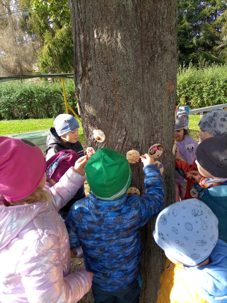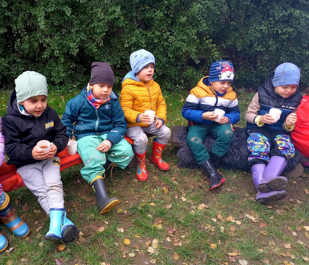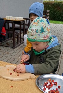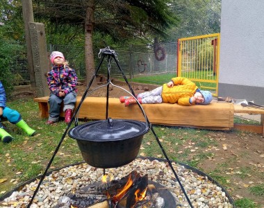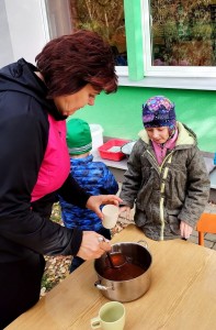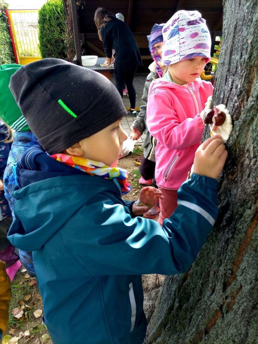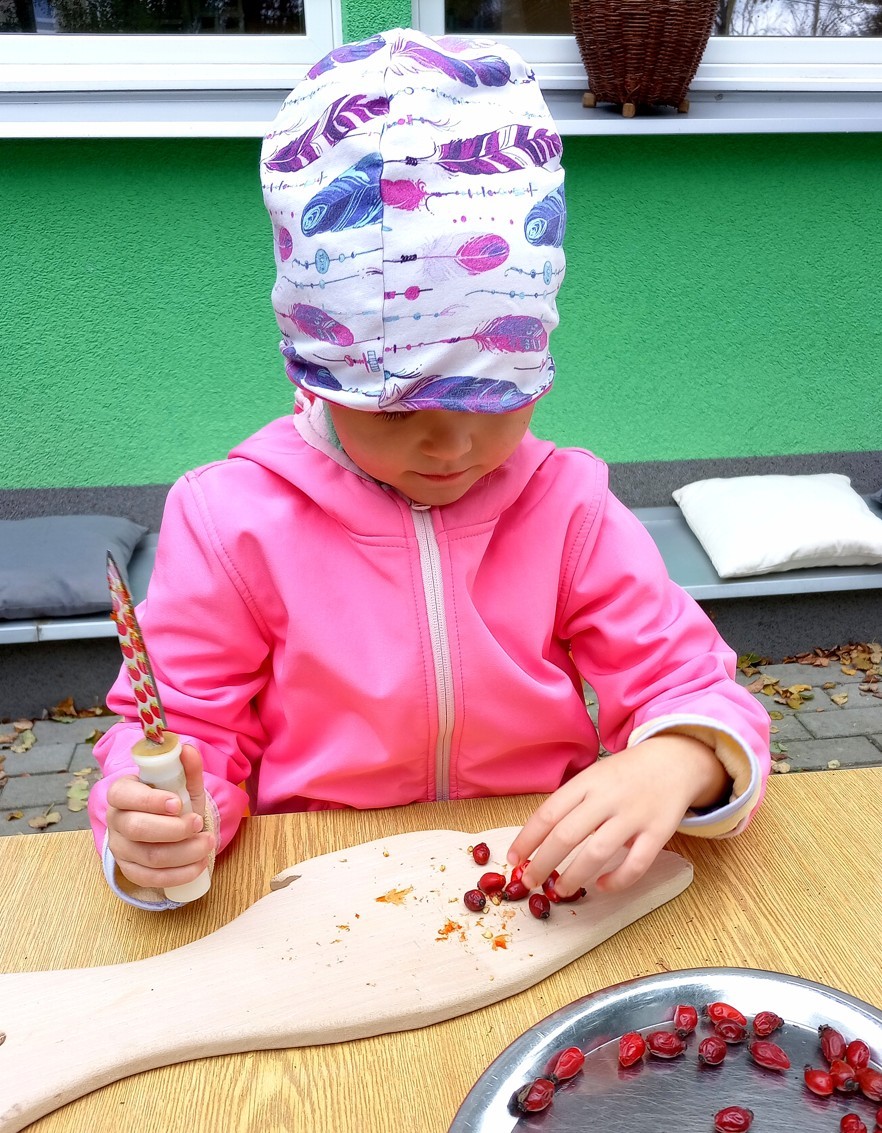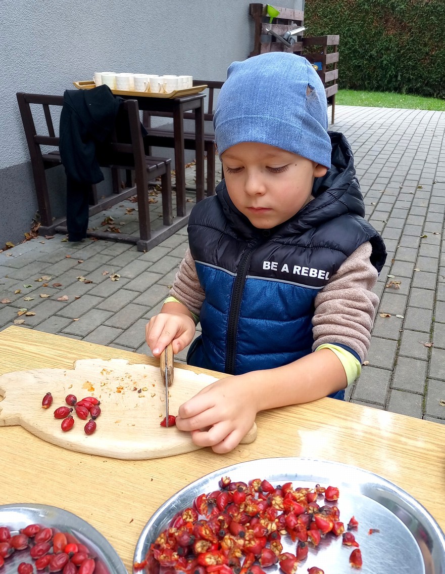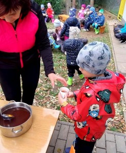Od samého rána se něco zajímavého dělo. Začalo se tím, že každé z dětí si po příchodu do třídy zabalilo bramboru do alobalu, ale co se s ní bude dít dál? To byla nejčastěší otázka malých zvídálků. Odpovědi se dětem dostalo hned po svačince, kdy se převlékly do teplého oblečení a přišly na zahrádku. Tam už paní učitelky měly rozdělaný oheň a mohli jsme společně do peřinky z popela uložit připravené brambory. No a abychom si čekání zkrátili, vydali jsme se natrhat šípky na čaj a také nasbírat nějaké podzimní plody na tvoření. Máme štěstí, že kolem školky je všechno blízko - jak šípkový keř tak i přírodní materiál jako jsou šišky, žaludy nebo různé druhy listí. Po přinesení šípků bylo nutné je rozpůlit a toho se ujaly všechny děti. Při zacházením s nožem byly moc šikovní a práce jim šla hezky od ruky. Paní učitelky nachystaly kotlík s teplou vodou, vložily nakrájené šípky a med. Než nám stačil čaj projít varem už jsme se nedočkavě pustili do pečených brambor. Většina dětí je ochutnávala poprvé a musíme přiznat, že měly docela úspěch (příště jen vychytáme dobu pečení). Po ochutnávce brambor a skvělého šípkové čaje přišla na řadu kreativní činnost - stromový, podzimní bubáci z těsta. Děti si je podle libosti mohly ozdobit jakýmkoliv materiálem, který byl k dispozici.