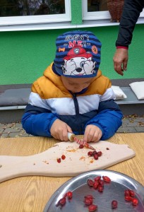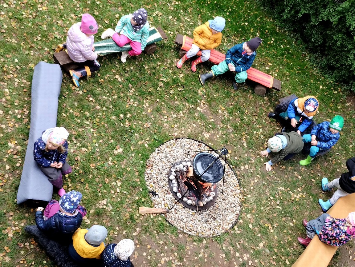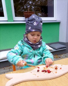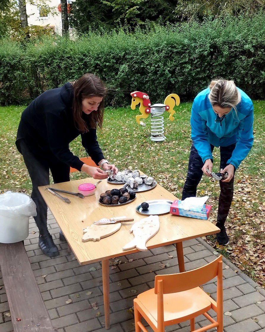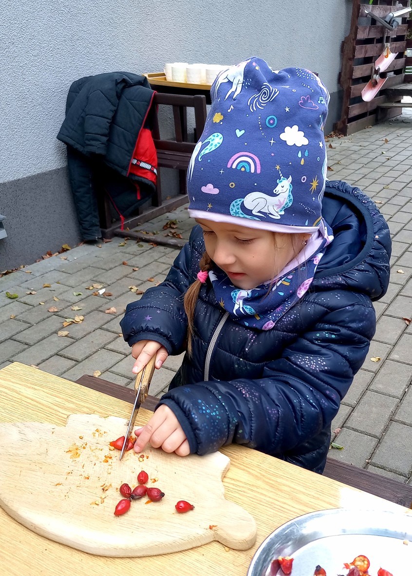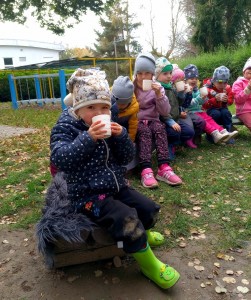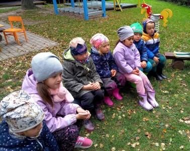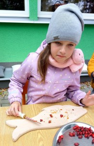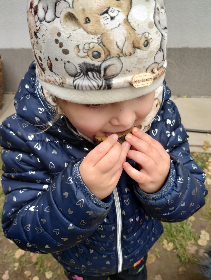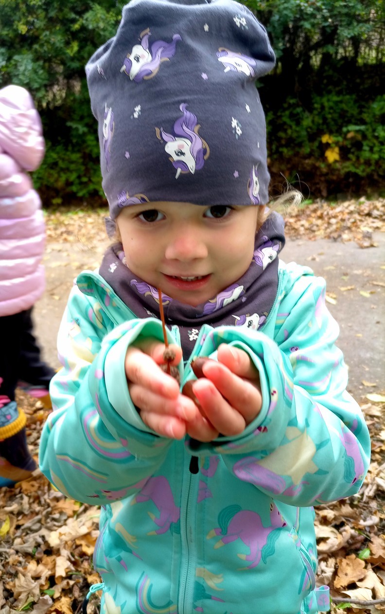 Od samého rána se něco zajímavého dělo. Začalo se tím, že každé z dětí si po příchodu do třídy zabalilo bramboru do alobalu, ale co se s ní bude dít dál? To byla nejčastěší otázka malých zvídálků. Odpovědi se dětem dostalo hned po svačince, kdy se převlékly do teplého oblečení a přišly na zahrádku. Tam už paní učitelky měly rozdělaný oheň a mohli jsme společně do peřinky z popela uložit připravené brambory. No a abychom si čekání zkrátili, vydali jsme se natrhat šípky na čaj a také nasbírat nějaké podzimní plody na tvoření. Máme štěstí, že kolem školky je všechno blízko - jak šípkový keř tak i přírodní materiál jako jsou šišky, žaludy nebo různé druhy listí. Po přinesení šípků bylo nutné je rozpůlit a toho se ujaly všechny děti. Při zacházením s nožem byly moc šikovní a práce jim šla hezky od ruky. Paní učitelky nachystaly kotlík s teplou vodou, vložily nakrájené šípky a med. Než nám stačil čaj projít varem už jsme se nedočkavě pustili do pečených brambor. Většina dětí je ochutnávala poprvé a musíme přiznat, že měly docela úspěch (příště jen vychytáme dobu pečení). Po ochutnávce brambor a skvělého šípkové čaje přišla na řadu kreativní činnost - stromový, podzimní bubáci z těsta. Děti si je podle libosti mohly ozdobit jakýmkoliv materiálem, který byl k dispozici.