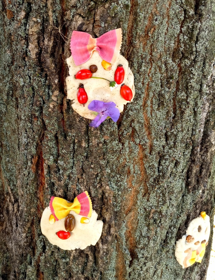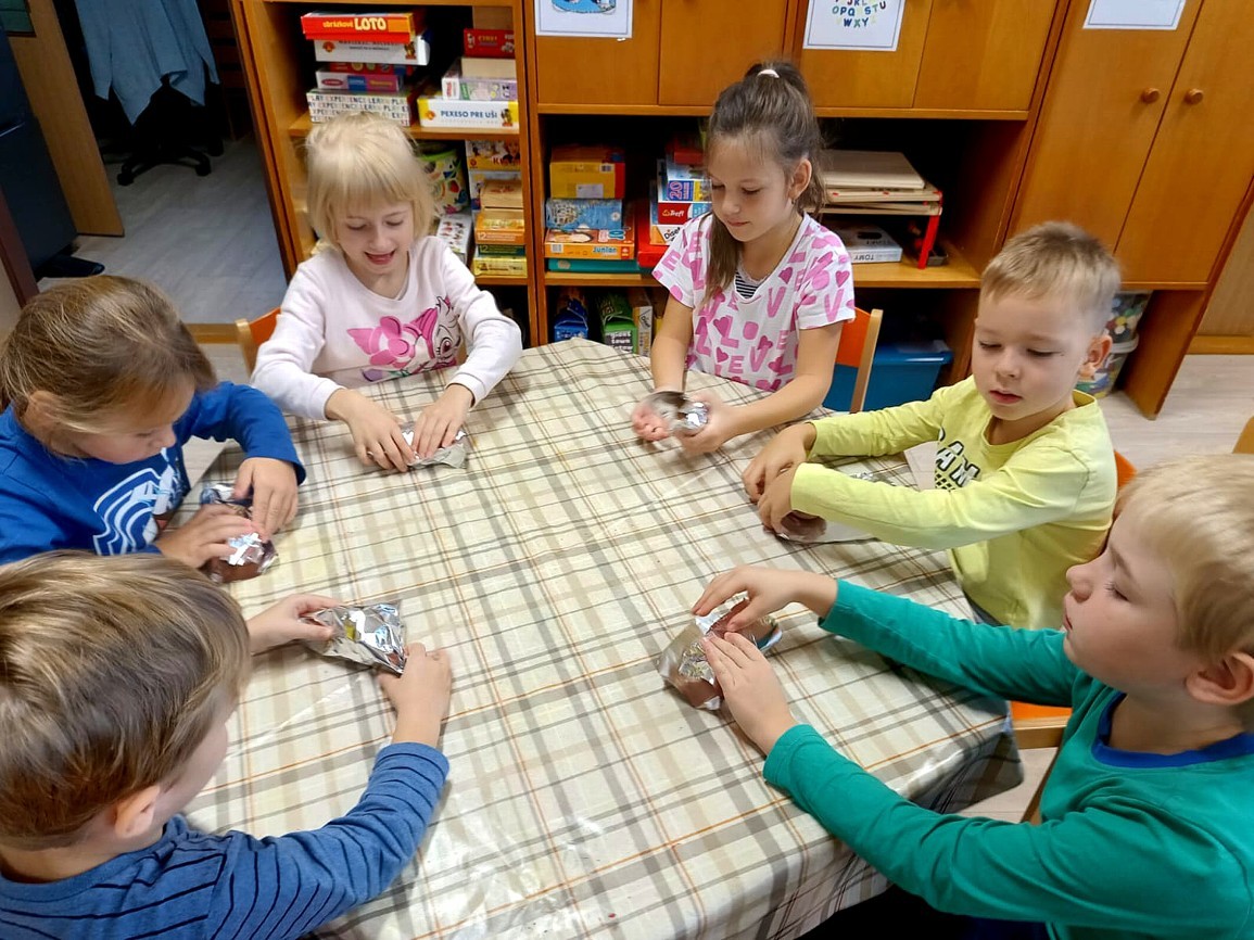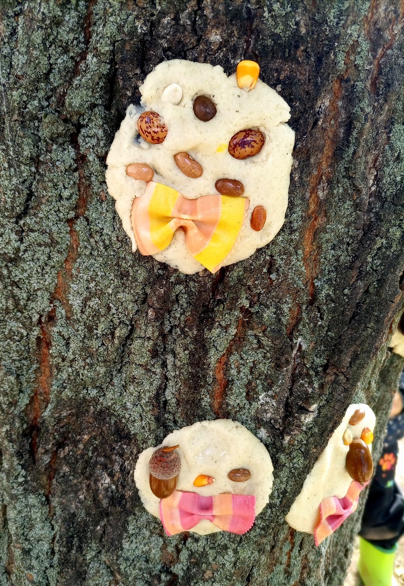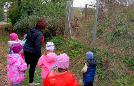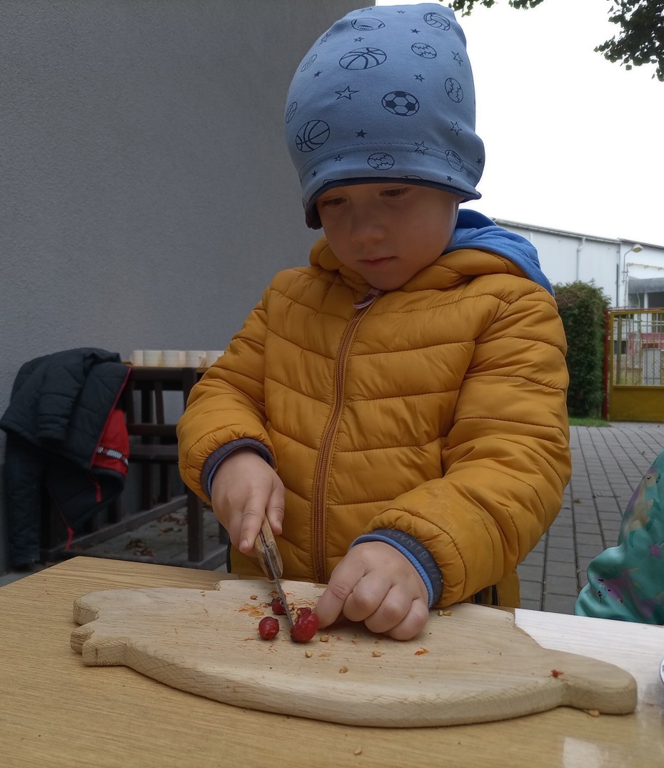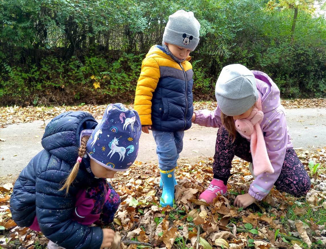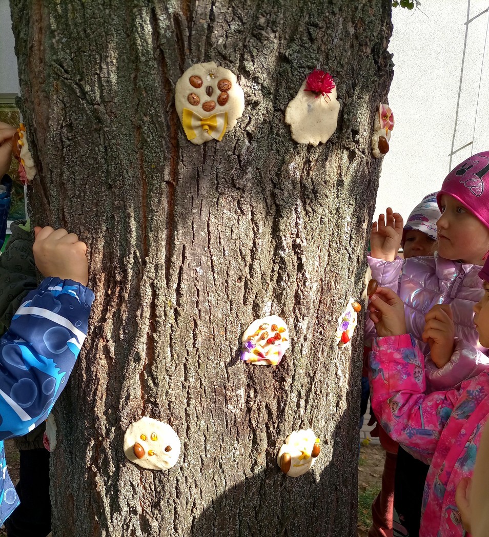 Od samého rána se něco zajímavého dělo. Začalo se tím, že každé z dětí si po příchodu do třídy zabalilo bramboru do alobalu, ale co se s ní bude dít dál? To byla nejčastěší otázka malých zvídálků. Odpovědi se dětem dostalo hned po svačince, kdy se převlékly do teplého oblečení a přišly na zahrádku. Tam už paní učitelky měly rozdělaný oheň a mohli jsme společně do peřinky z popela uložit připravené brambory. No a abychom si čekání zkrátili, vydali jsme se natrhat šípky na čaj a také nasbírat nějaké podzimní plody na tvoření. Máme štěstí, že kolem školky je všechno blízko - jak šípkový keř tak i přírodní materiál jako jsou šišky, žaludy nebo různé druhy listí. Po přinesení šípků bylo nutné je rozpůlit a toho se ujaly všechny děti. Při zacházením s nožem byly moc šikovní a práce jim šla hezky od ruky. Paní učitelky nachystaly kotlík s teplou vodou, vložily nakrájené šípky a med. Než nám stačil čaj projít varem už jsme se nedočkavě pustili do pečených brambor. Většina dětí je ochutnávala poprvé a musíme přiznat, že měly docela úspěch (příště jen vychytáme dobu pečení). Po ochutnávce brambor a skvělého šípkové čaje přišla na řadu kreativní činnost - stromový, podzimní bubáci z těsta. Děti si je podle libosti mohly ozdobit jakýmkoliv materiálem, který byl k dispozici.
