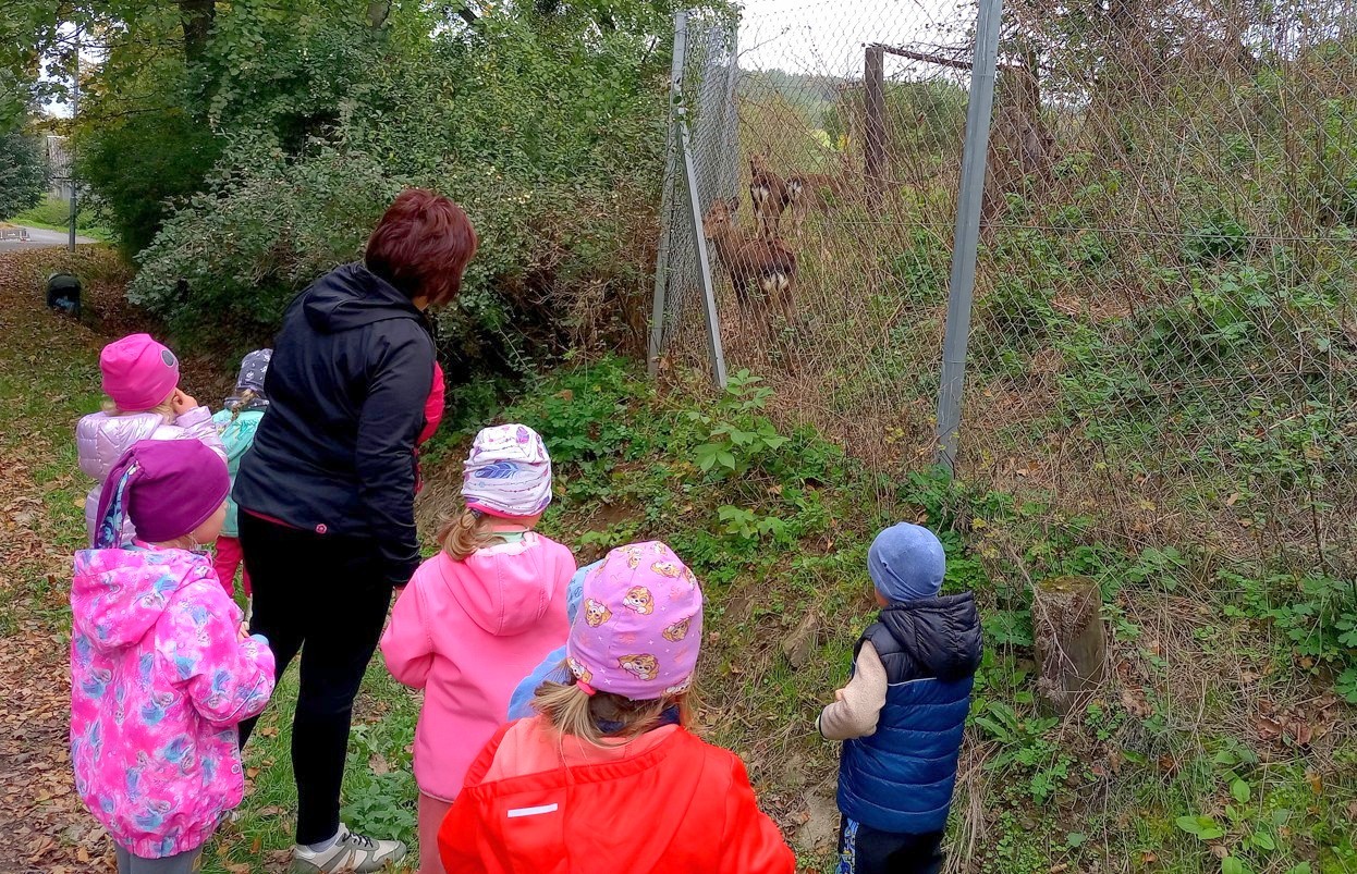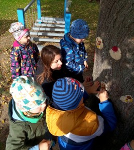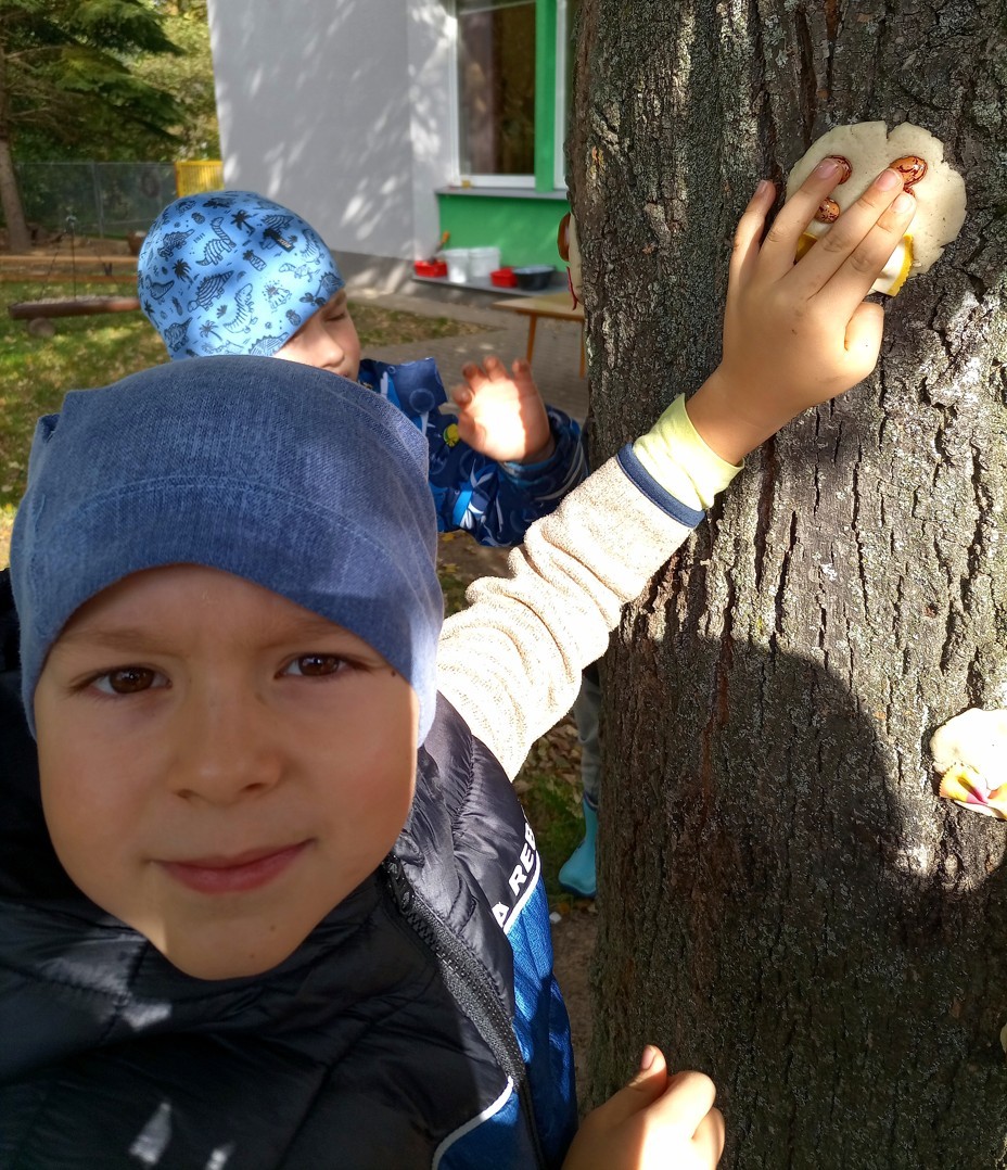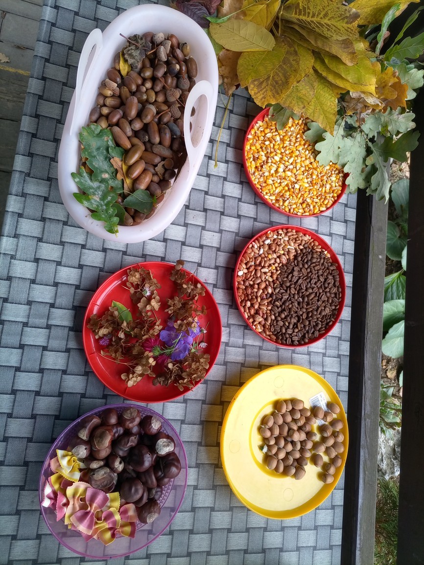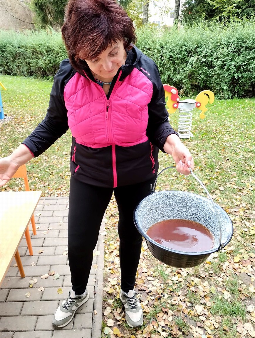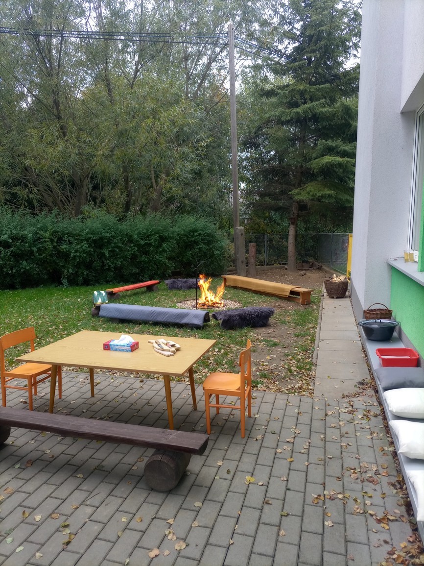 Od samého rána se něco zajímavého dělo. Začalo se tím, že každé z dětí si po příchodu do třídy zabalilo bramboru do alobalu, ale co se s ní bude dít dál? To byla nejčastěší otázka malých zvídálků. Odpovědi se dětem dostalo hned po svačince, kdy se převlékly do teplého oblečení a přišly na zahrádku. Tam už paní učitelky měly rozdělaný oheň a mohli jsme společně do peřinky z popela uložit připravené brambory. No a abychom si čekání zkrátili, vydali jsme se natrhat šípky na čaj a také nasbírat nějaké podzimní plody na tvoření. Máme štěstí, že kolem školky je všechno blízko - jak šípkový keř tak i přírodní materiál jako jsou šišky, žaludy nebo různé druhy listí. Po přinesení šípků bylo nutné je rozpůlit a toho se ujaly všechny děti. Při zacházením s nožem byly moc šikovní a práce jim šla hezky od ruky. Paní učitelky nachystaly kotlík s teplou vodou, vložily nakrájené šípky a med. Než nám stačil čaj projít varem už jsme se nedočkavě pustili do pečených brambor. Většina dětí je ochutnávala poprvé a musíme přiznat, že měly docela úspěch (příště jen vychytáme dobu pečení). Po ochutnávce brambor a skvělého šípkové čaje přišla na řadu kreativní činnost - stromový, podzimní bubáci z těsta. Děti si je podle libosti mohly ozdobit jakýmkoliv materiálem, který byl k dispozici.
