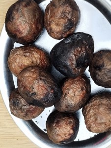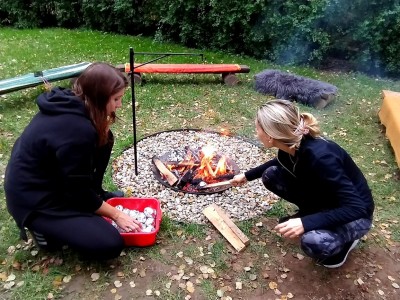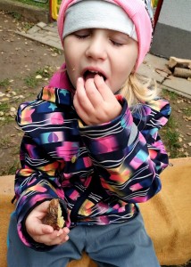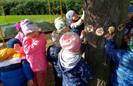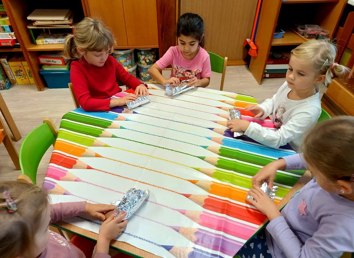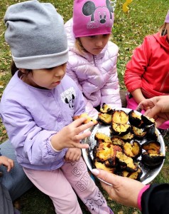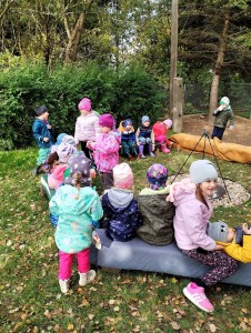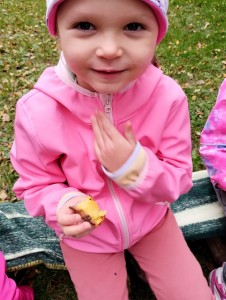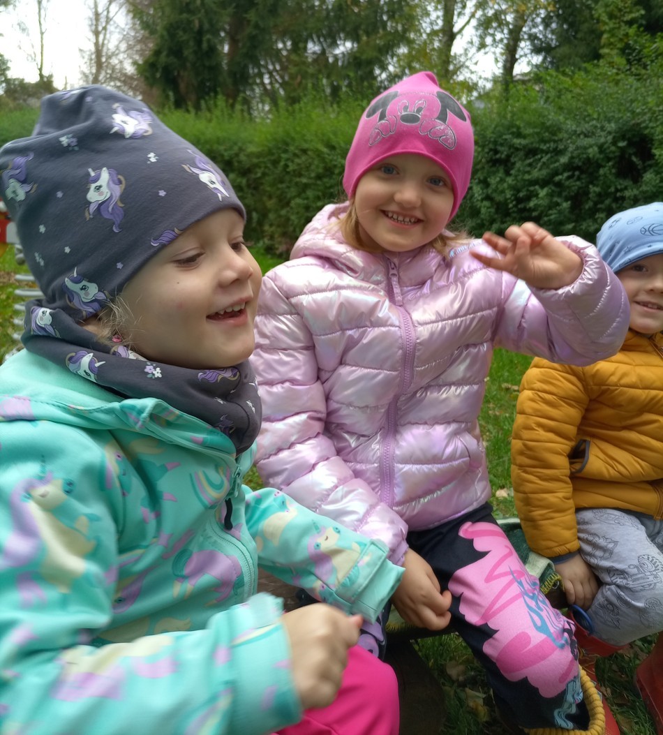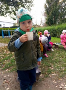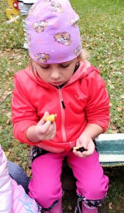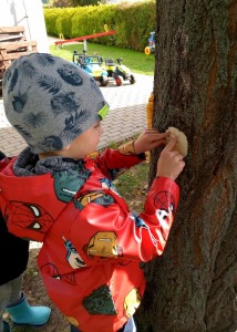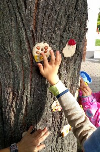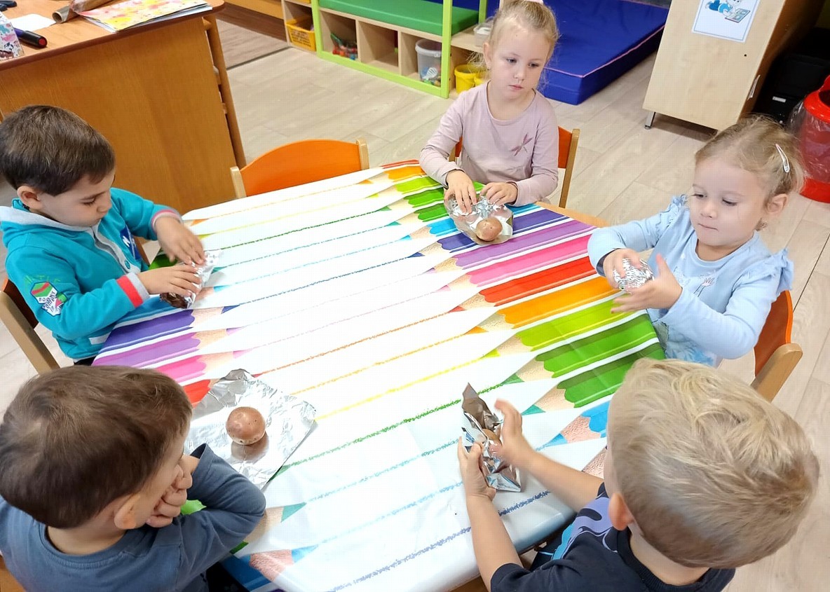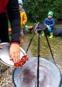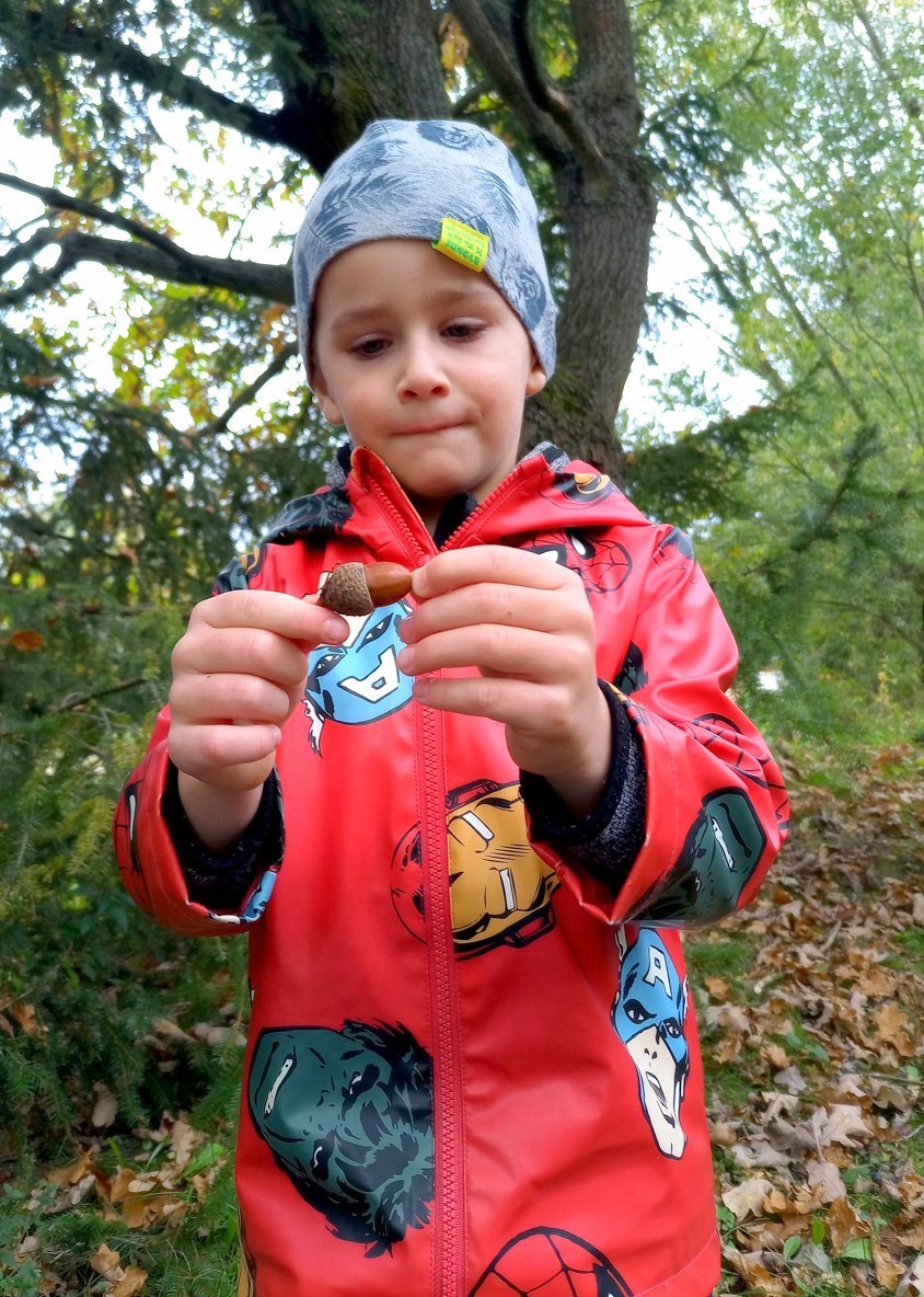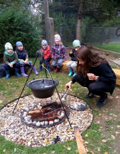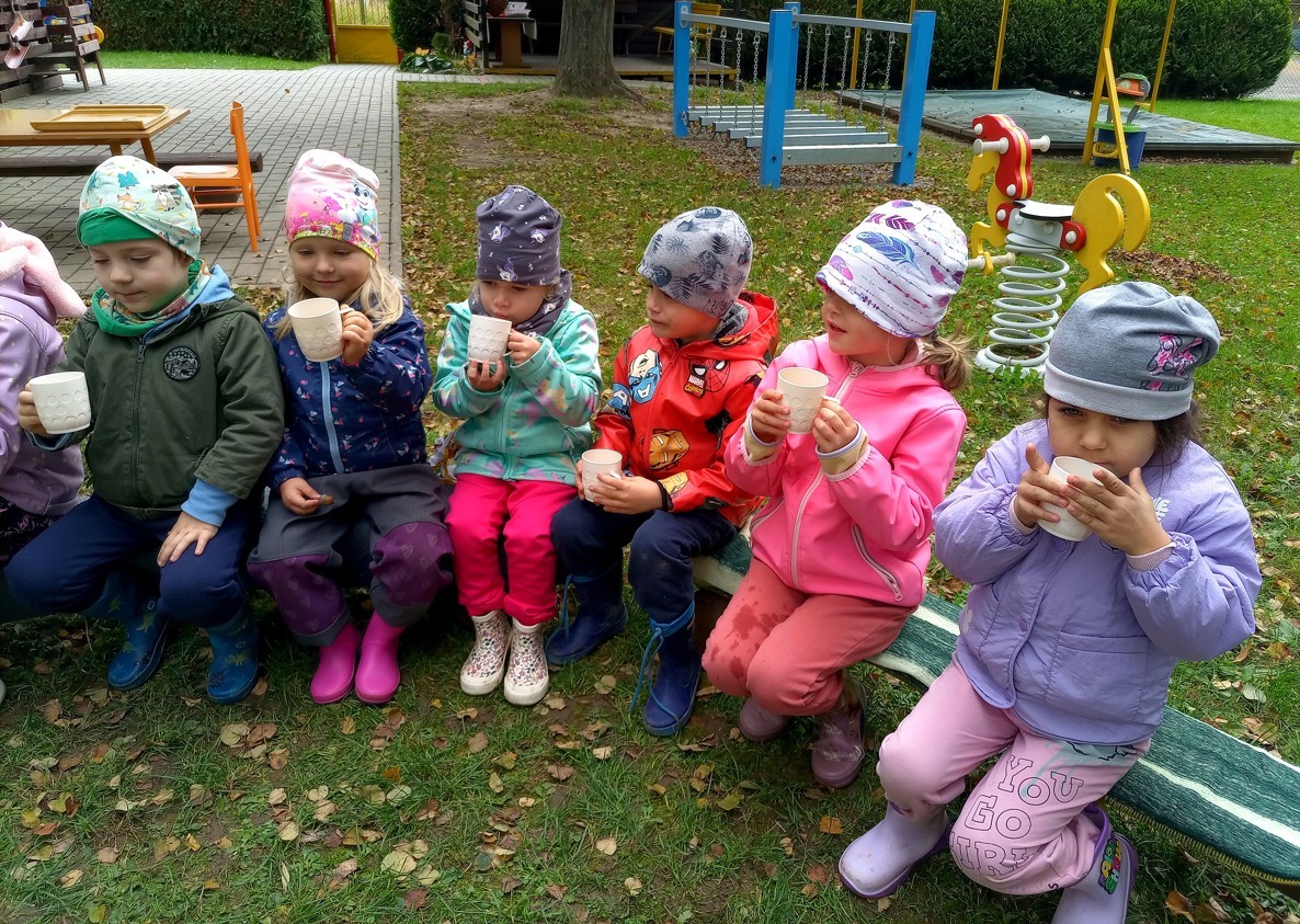 Od samého rána se něco zajímavého dělo. Začalo se tím, že každé z dětí si po příchodu do třídy zabalilo bramboru do alobalu, ale co se s ní bude dít dál? To byla nejčastěší otázka malých zvídálků. Odpovědi se dětem dostalo hned po svačince, kdy se převlékly do teplého oblečení a přišly na zahrádku. Tam už paní učitelky měly rozdělaný oheň a mohli jsme společně do peřinky z popela uložit připravené brambory. No a abychom si čekání zkrátili, vydali jsme se natrhat šípky na čaj a také nasbírat nějaké podzimní plody na tvoření. Máme štěstí, že kolem školky je všechno blízko - jak šípkový keř tak i přírodní materiál jako jsou šišky, žaludy nebo různé druhy listí. Po přinesení šípků bylo nutné je rozpůlit a toho se ujaly všechny děti. Při zacházením s nožem byly moc šikovní a práce jim šla hezky od ruky. Paní učitelky nachystaly kotlík s teplou vodou, vložily nakrájené šípky a med. Než nám stačil čaj projít varem už jsme se nedočkavě pustili do pečených brambor. Většina dětí je ochutnávala poprvé a musíme přiznat, že měly docela úspěch (příště jen vychytáme dobu pečení). Po ochutnávce brambor a skvělého šípkové čaje přišla na řadu kreativní činnost - stromový, podzimní bubáci z těsta. Děti si je podle libosti mohly ozdobit jakýmkoliv materiálem, který byl k dispozici.