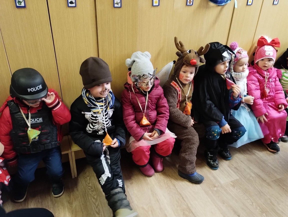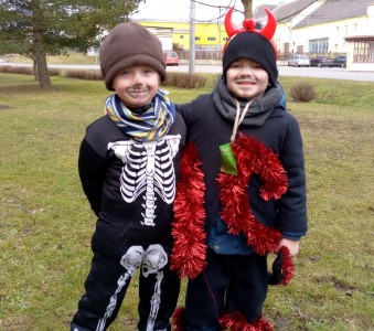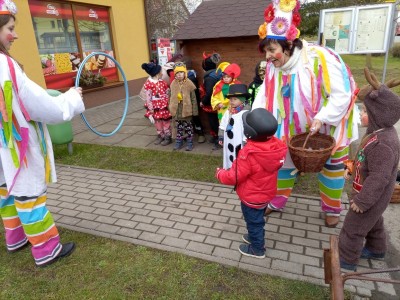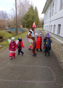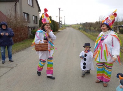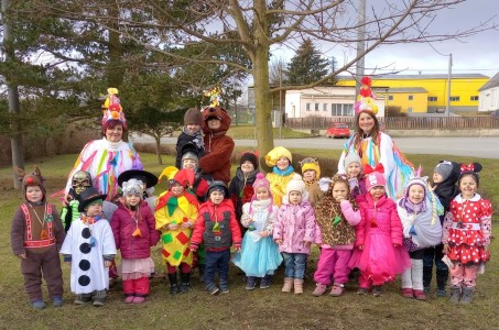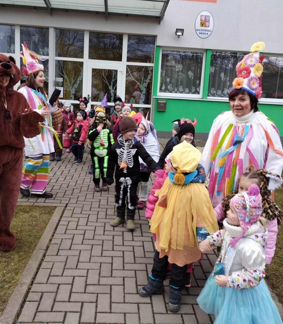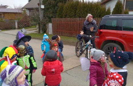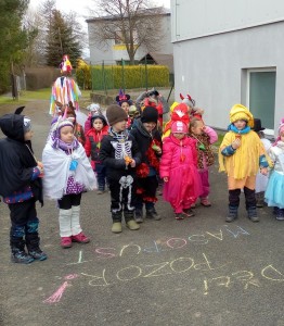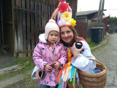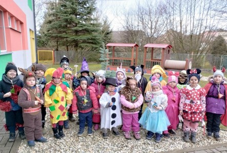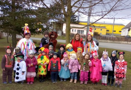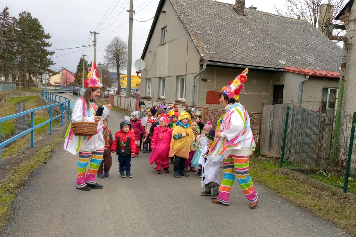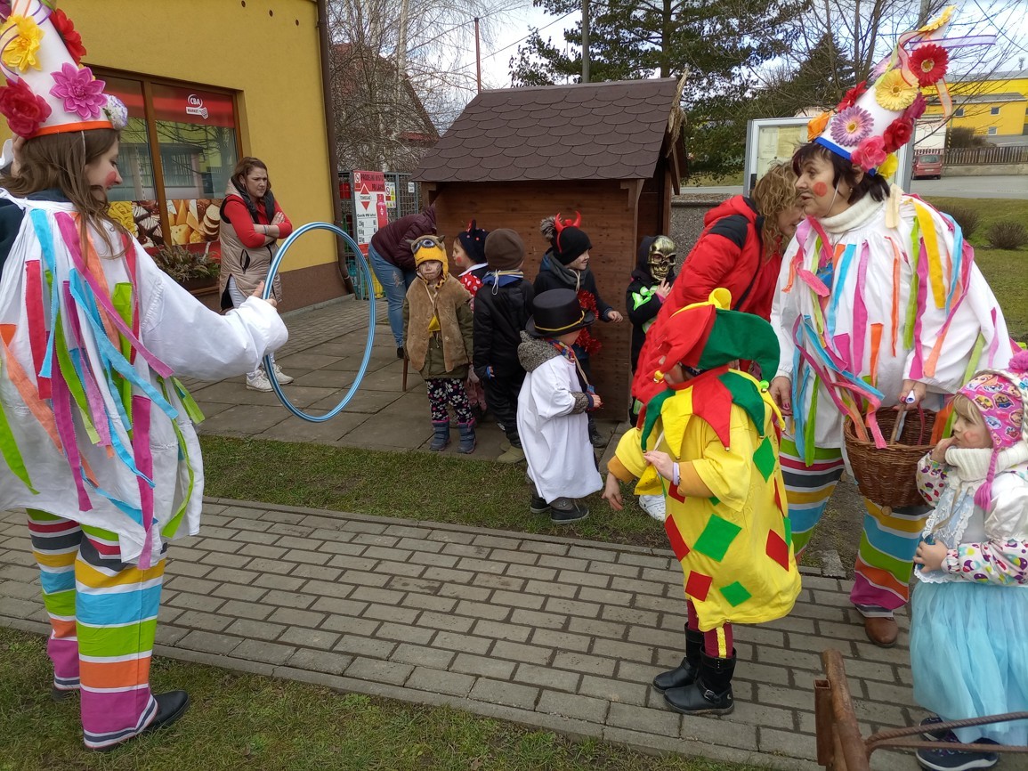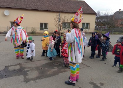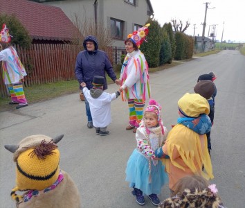 Tak jsme si poprve ve školce vyzkoušeli masopustní průvod vesnicí.Jelikož je naše vesnička dlouhá a naše nožičky krátké, rozplánovali jsme si tuhle veselici na dva dny. První den jsme se vydali na dolní konec Klopiny. Snad se nám podařilo několik lidiček rozveselit písničkami, říkankami i tanečky. A veselo bylo. Zpívali jsme, tančili, chrastili šterchadly, mávali na všechny kolemjdoucí i jedoucí. Cestou jsme plnili i jednoducké úkoly. Např. chůze po klikatých cestičkách, zahráli jsme si hru na masopust, házeli jsme jitrnicemi...Děkujeme všem za milé úsměvy i dobrůtky, které jsme obdrželi. Máme je ve školce a občas si smlsneme. Hlavním naším cílem bylo vykouzlit všem úsměv na tváři, rozveselit naši vesnici, připomenout tradici Masopustu. Děkujeme za občerstvení u obchůdku "U Klinků". Koblížky byly vynikající a teplý čaj také přišel vhod. Vrátili jsme se do školky unaveni, ale nadmíru spokojeni.