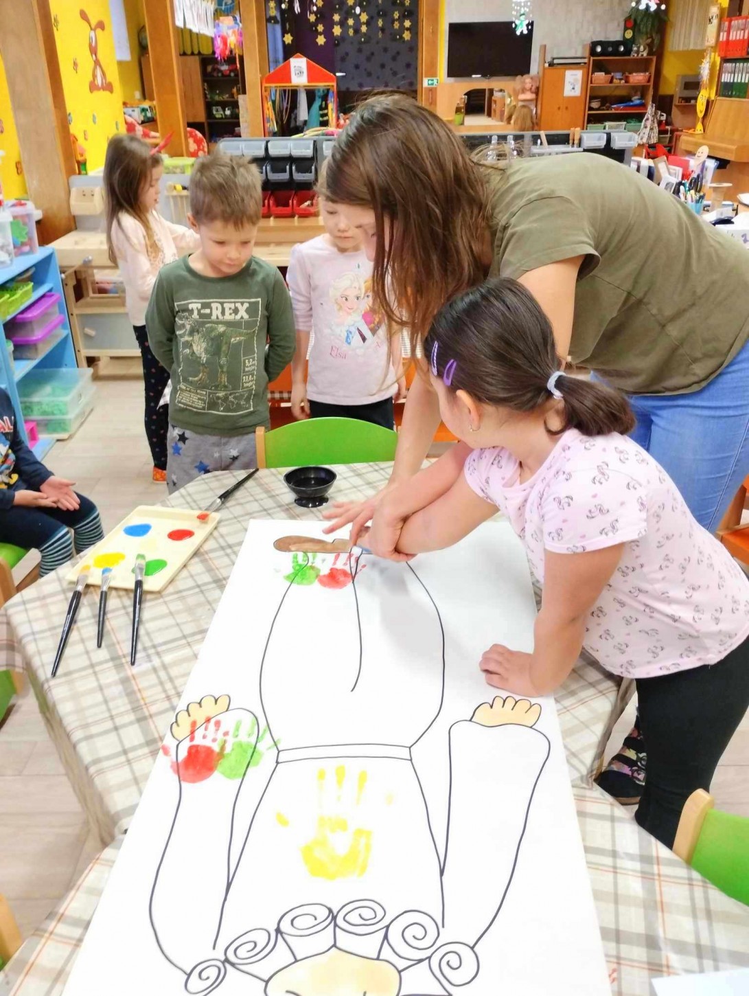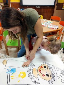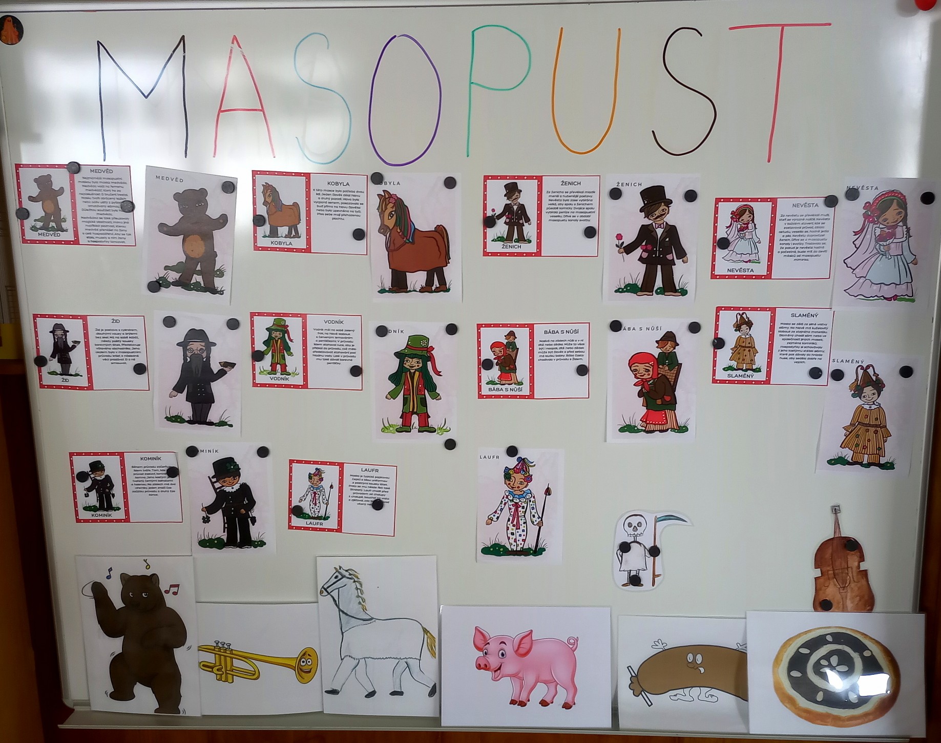 V čase před samotným průvodem naší Klopinou dětem vysvětlujeme co vlastně masopust znamená, povídáme si o typických maškarách a plníme různé úkoly. Letos děti společně s paní učitelkou Adélkou vytvořili Laufra v nadživotní velikosti a také vyráběli trumpetky.