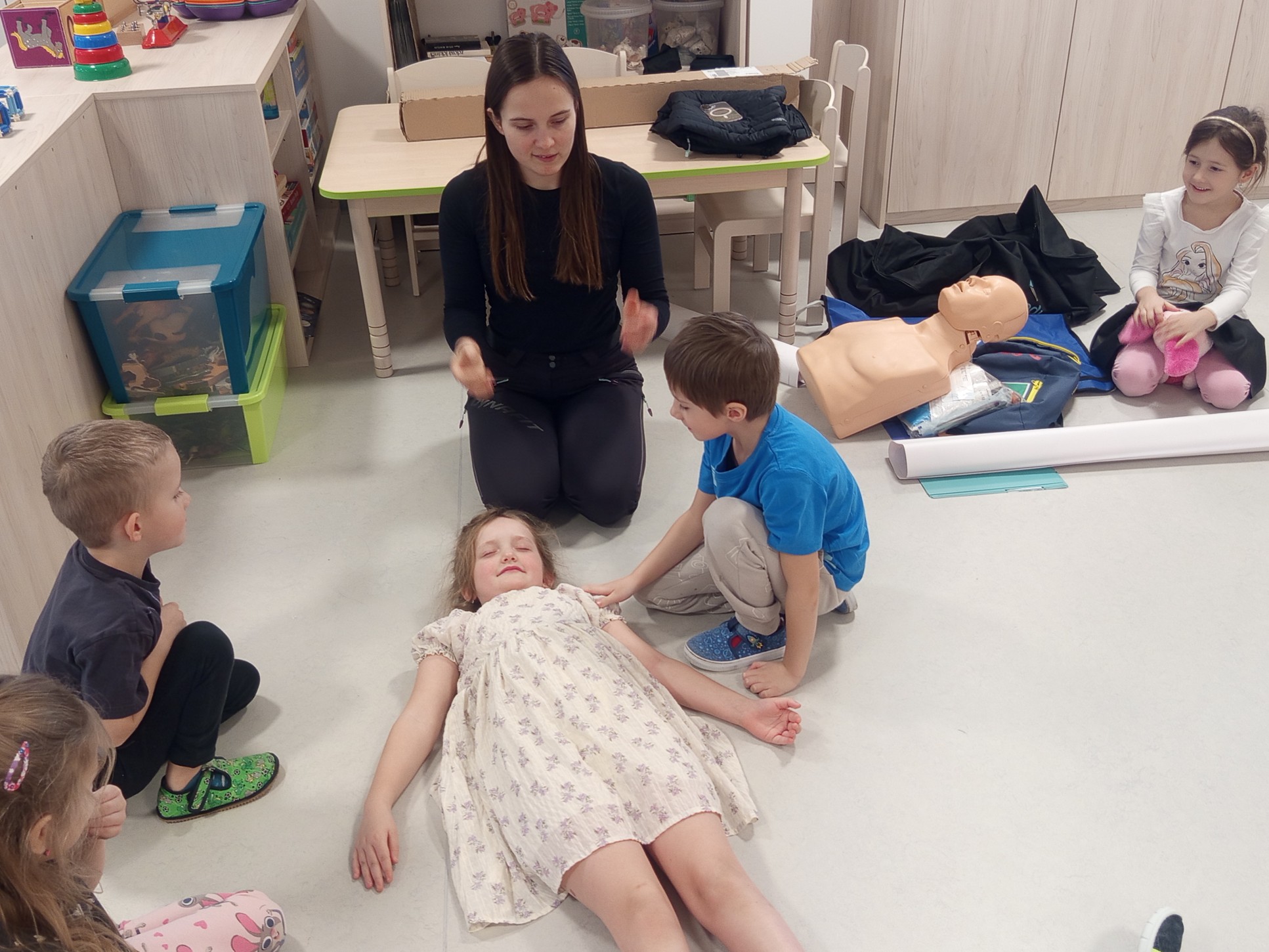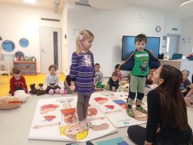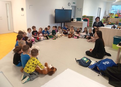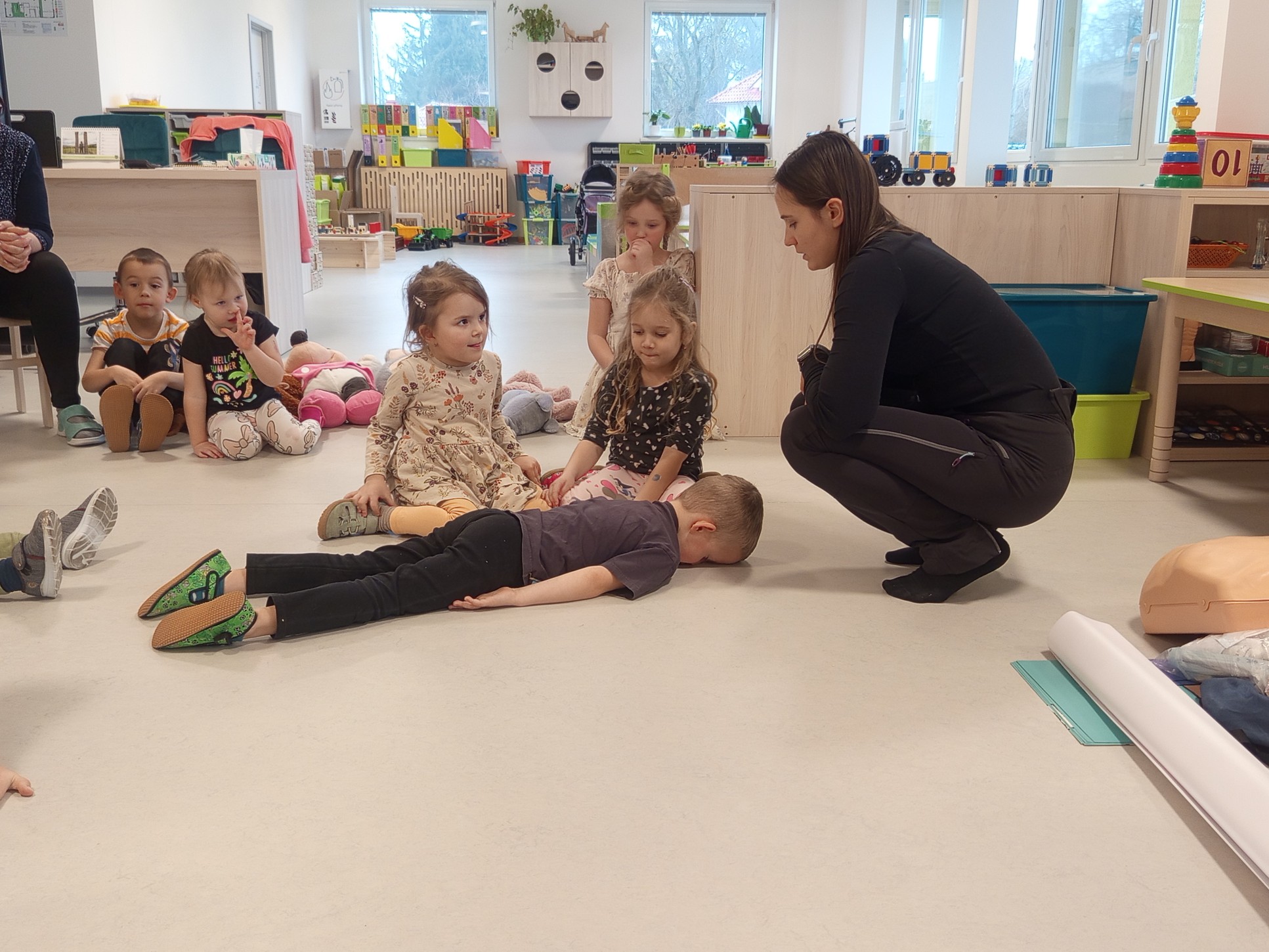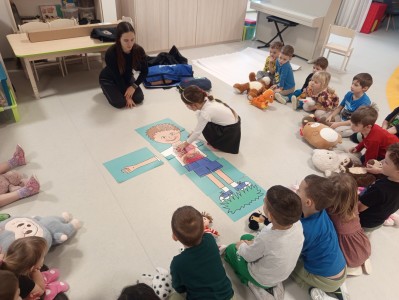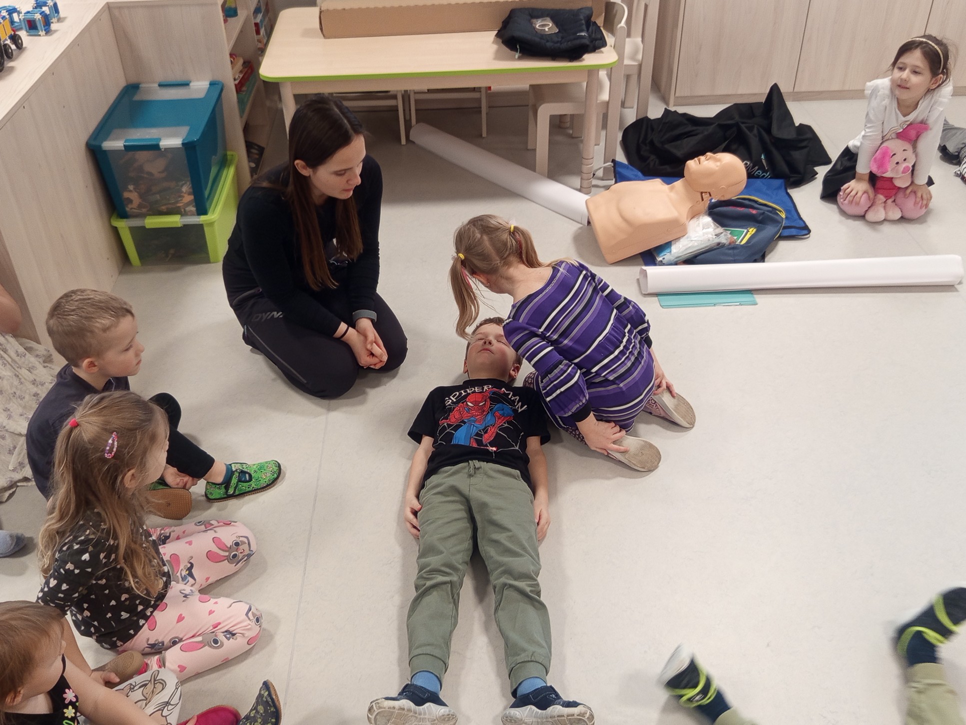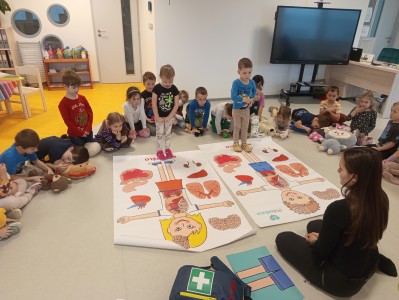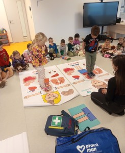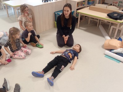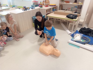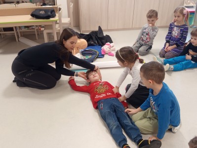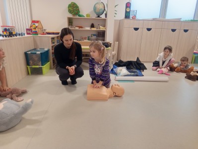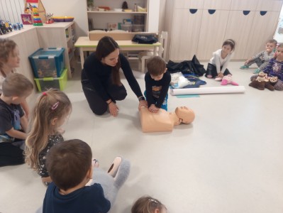 Jak správně reagovat a jak se zachovat v neočekávané situaci? Jak přivolat pomoc a zachránit třeba svého kamaráda? To nás přijela naučit paní zachranářka ze vzdělávací instituce PMEDUCA. Děti si hravou formou zopakovaly důležitá telefonní čísla IZS a vyzkoušely si na svých plyšácích jak provést srdeční masaž.