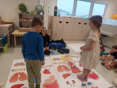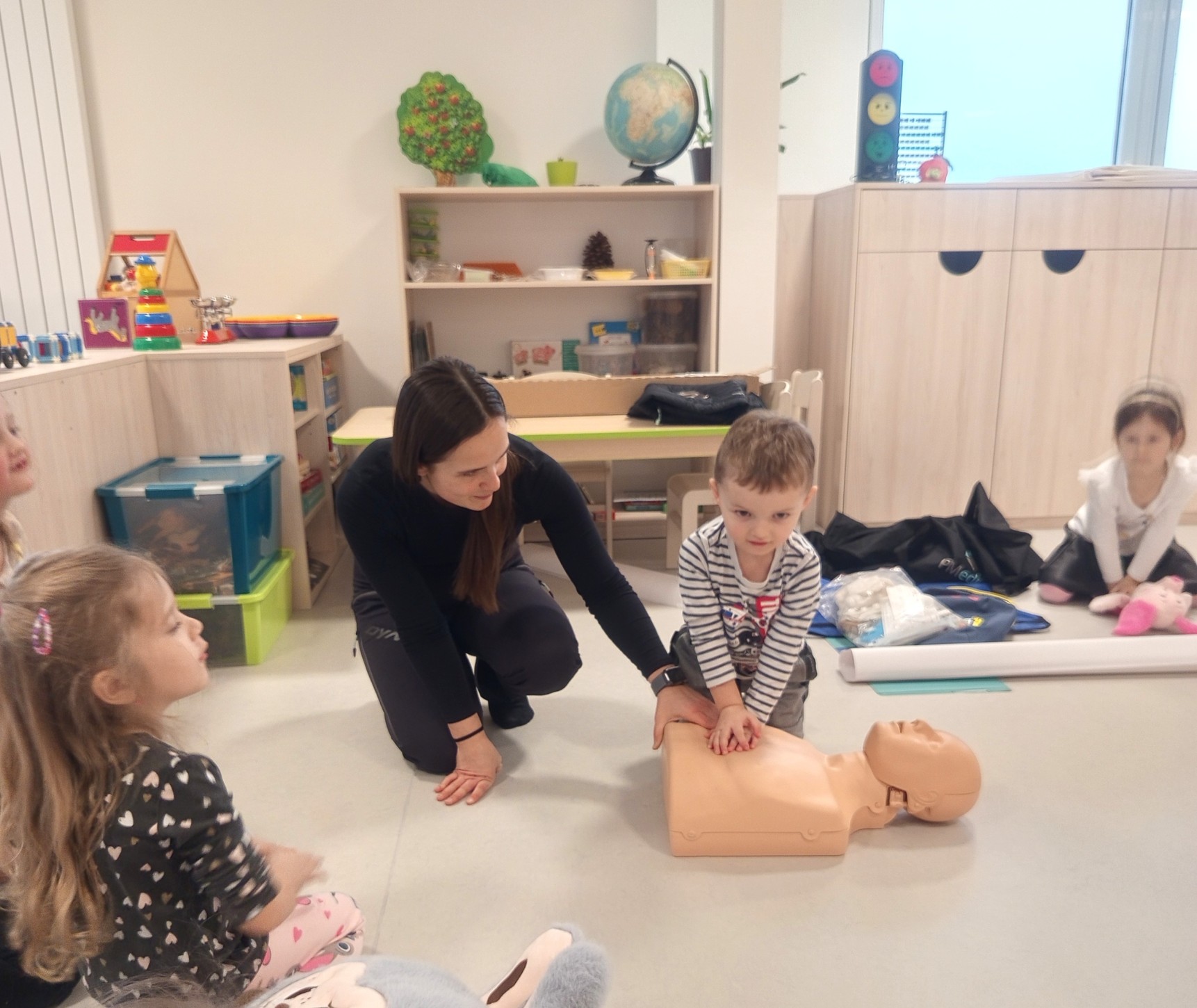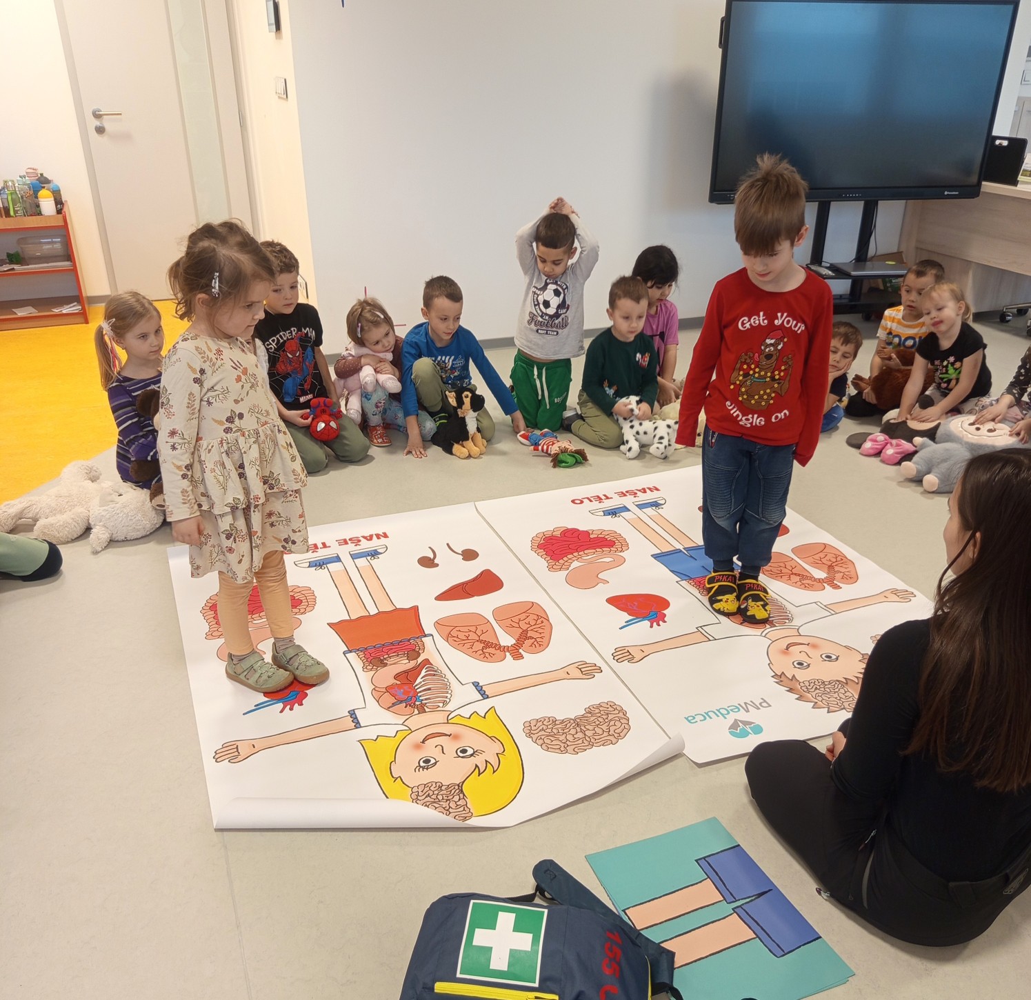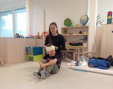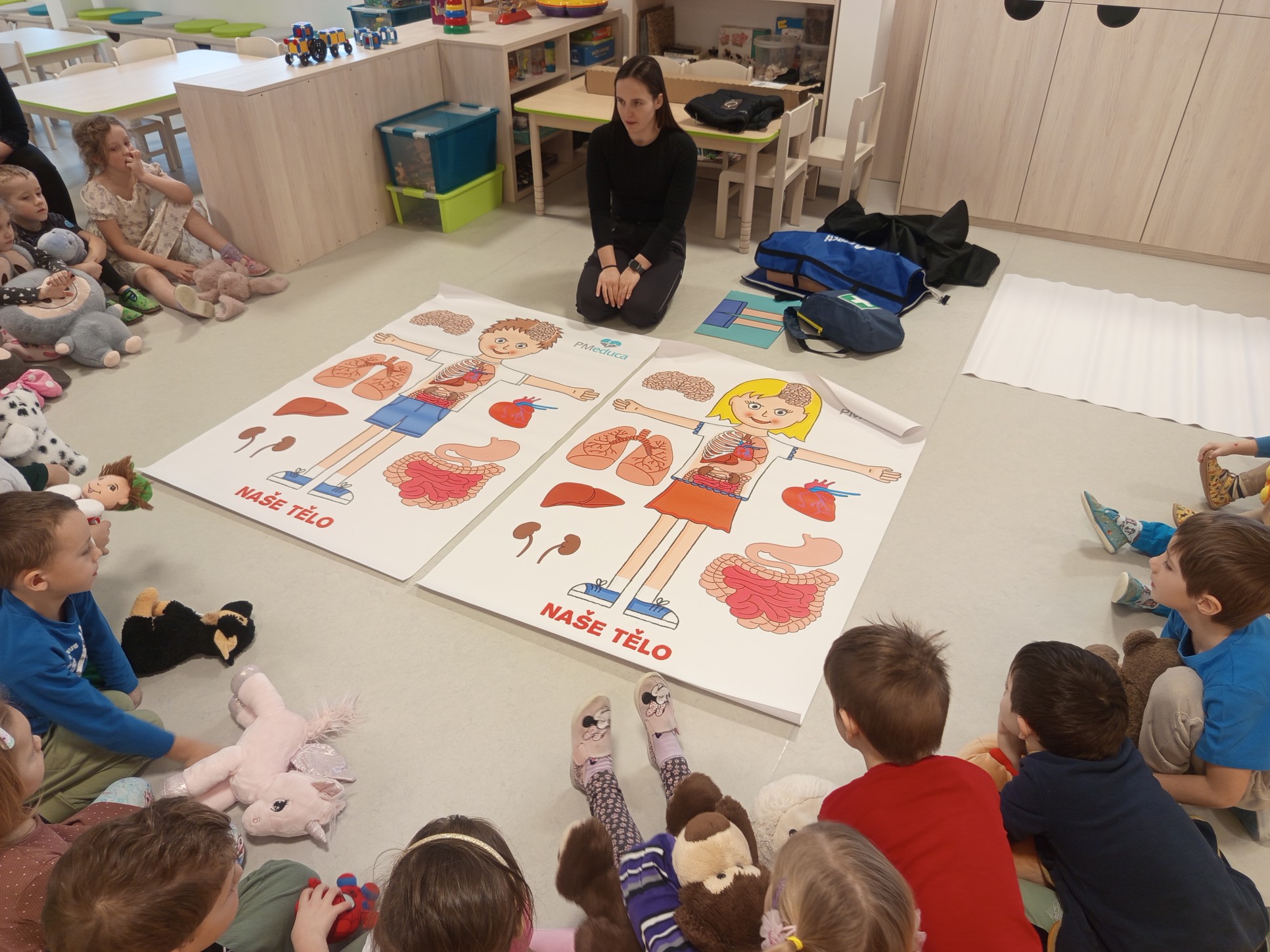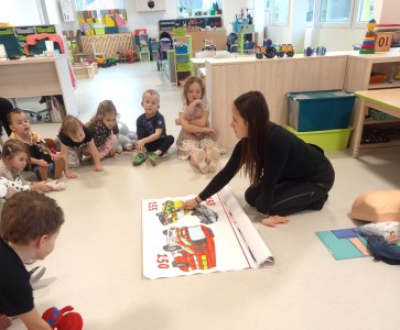 Jak správně reagovat a jak se zachovat v neočekávané situaci? Jak přivolat pomoc a zachránit třeba svého kamaráda? To nás přijela naučit paní zachranářka ze vzdělávací instituce PMEDUCA. Děti si hravou formou zopakovaly důležitá telefonní čísla IZS a vyzkoušely si na svých plyšácích jak provést srdeční masaž.