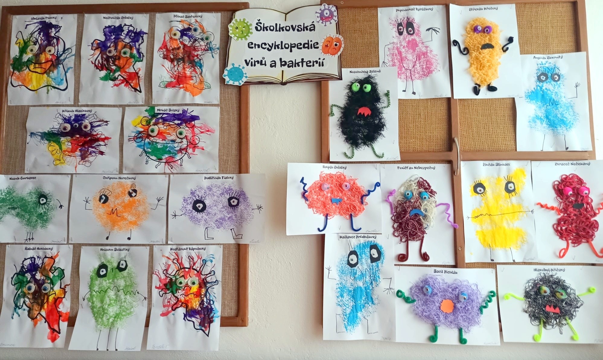 K zimnímu období patří různé rýmičky, kašláníčko, teploty jednoduše nachlazení a nemoci. Proto jsme tento týden probrali téma bacily a viry. Ukázali jsme si a popsali lékárničku - co obsahuje a co se k čemu používá. Děti správně poznamenaly, že léky jim mohou dát pouze dospěláci. Popovídali jsme si o tom jak nemocem předcházet, co je pro pevné zdraví dobré jíst a co by jsme si měli dát spíše vyjjmečně. Na deset minut si děti odpočaly u edukativního miniseriálu o virech a pak se mohly vrhnout na výtvarnou část, kdy malovaly různými technikami bacily. Těm také společně vymýšlely prapodivné názvy. Výtvory visí na nástěnce, tak až půjdete okolo podívejte se jaká jména děti napadaly :)
