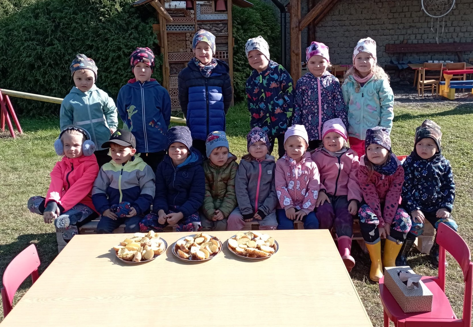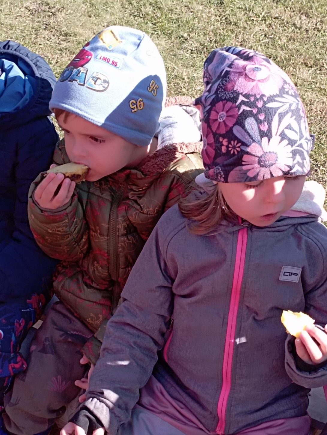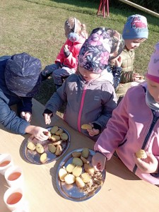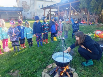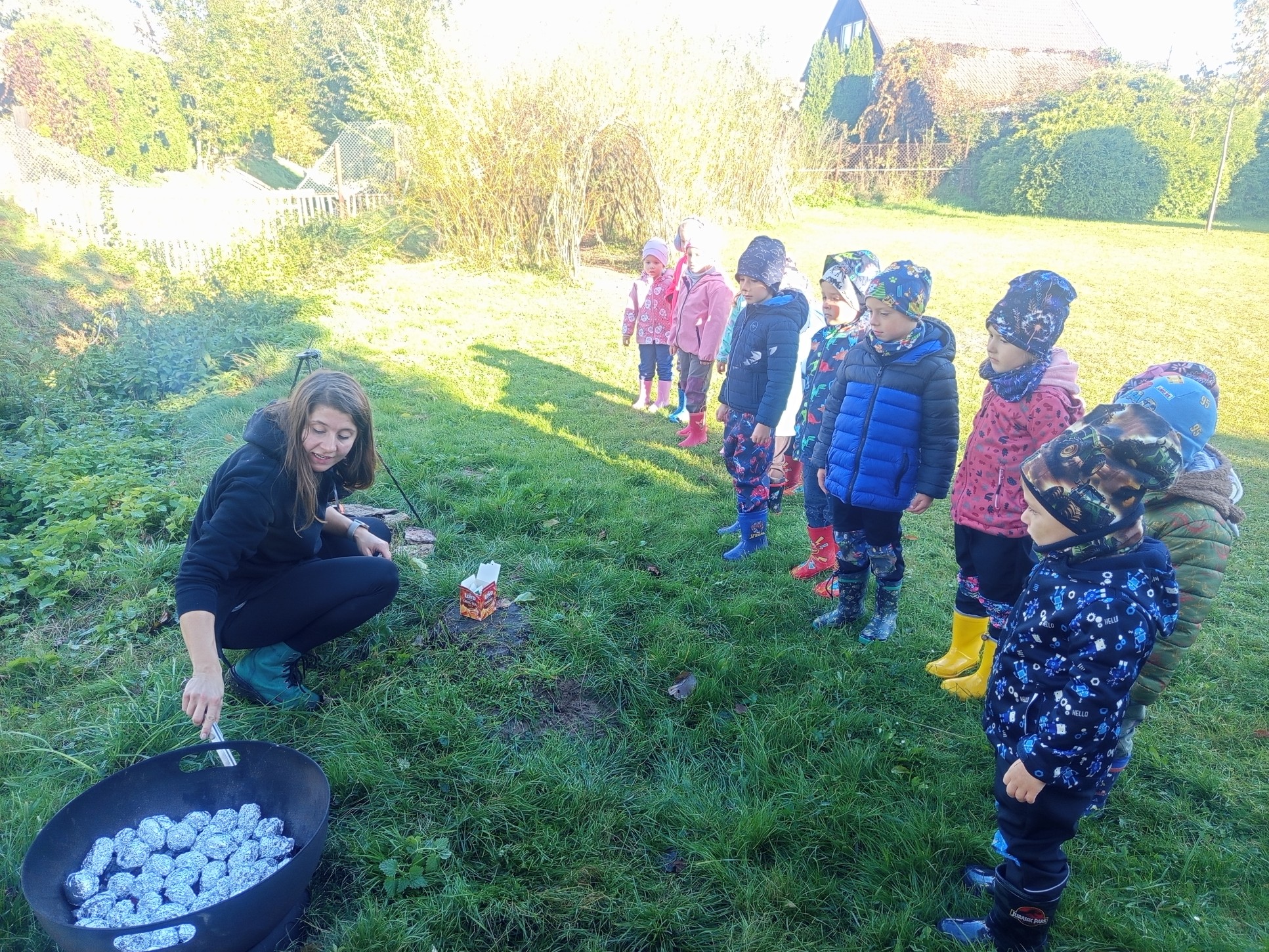 A to nejlepší přišlo nakonec! Jako poslední jsme si užili venkovní hodování - podávaly se brambory pečené v popelu a lahodný medový čaj. Co se týče samotných brambor, tak děti sami každý jeden kus zabalily do alobalu a nachystaly paní učitelce. Ta poté hlídala čas, aby brambory byly připravené tak akorát k jídlu. Povedlo se a na výsledku jsme si moc pochutnali!