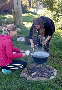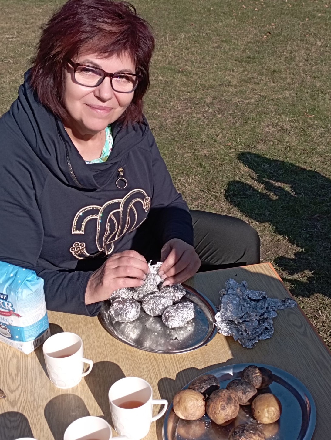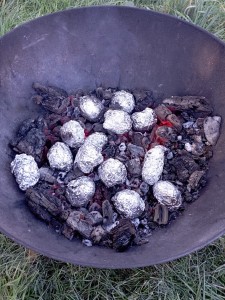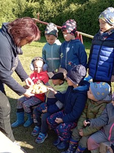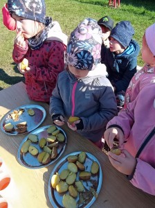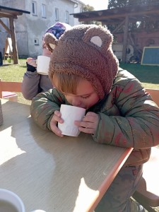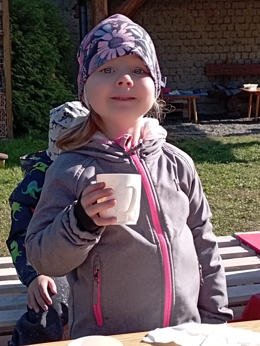 A to nejlepší přišlo nakonec! Jako poslední jsme si užili venkovní hodování - podávaly se brambory pečené v popelu a lahodný medový čaj. Co se týče samotných brambor, tak děti sami každý jeden kus zabalily do alobalu a nachystaly paní učitelce. Ta poté hlídala čas, aby brambory byly připravené tak akorát k jídlu. Povedlo se a na výsledku jsme si moc pochutnali!